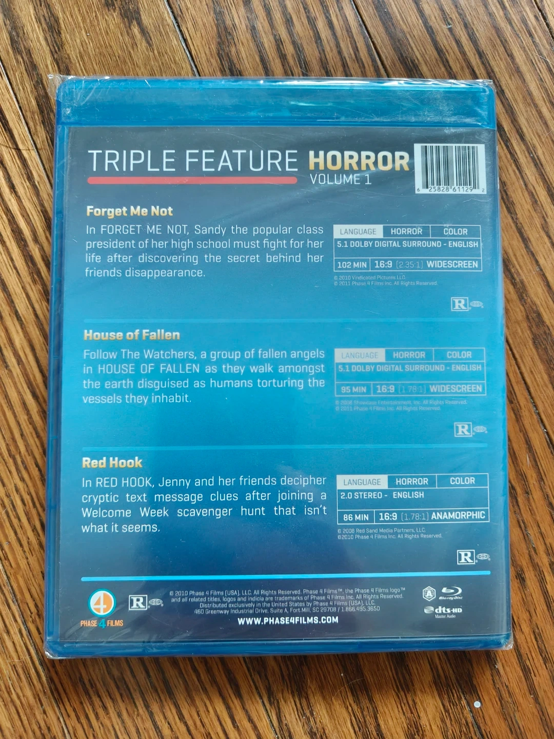 This is a triple feature Blu-ray collection of horror films, including Forget Me Not, House of Fallen, and Red Hook. All movies are in widescreen format with 5.1 Dolby Digital Surround sound. Get ready for some scares!
