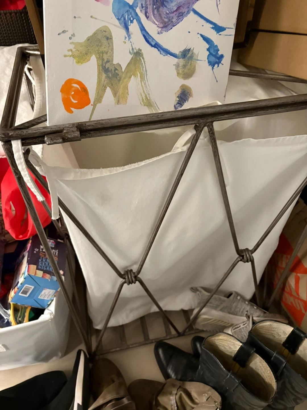 This metal frame laundry hamper comes with a removable white fabric liner. It's a sturdy bin for organizing laundry or other household items. It would be useful in a bedroom or bathroom for keeping clothes tidy.