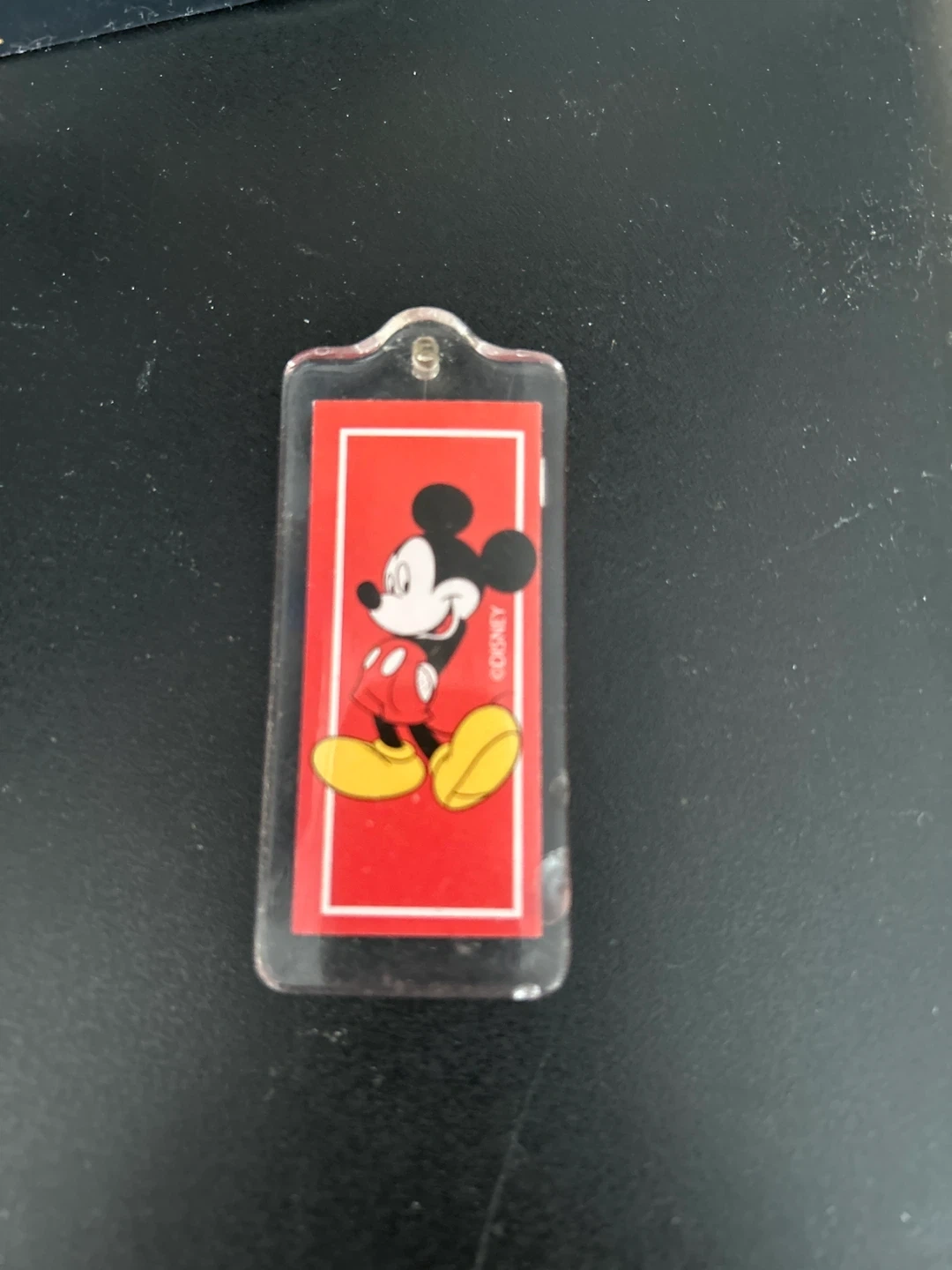 This is a clear keychain featuring Mickey Mouse on a red background. It's a fun accessory for any Disney fan! The keychain has a metal ring for easy attachment to keys or bags.