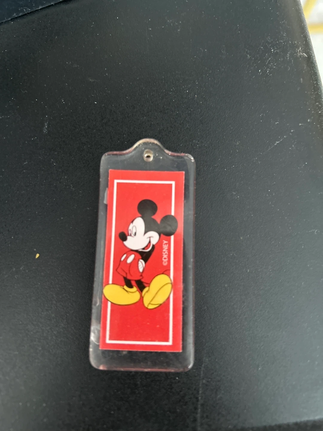 This is a clear keychain featuring Mickey Mouse on a red background. It's a fun accessory for any Disney fan! The keychain has a metal ring for easy attachment to keys or bags.