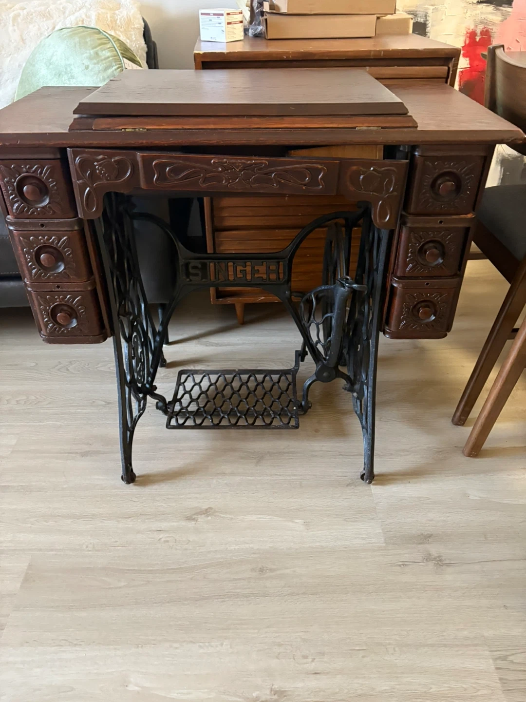 This is a vintage Singer sewing machine cabinet with intricate carvings and multiple small drawers. It features a cast iron treadle base with decorative scrollwork. The top folds down for a flat surface when the machine isn't in use. It's a beautiful piece for a sewing room or as a unique accent table.
