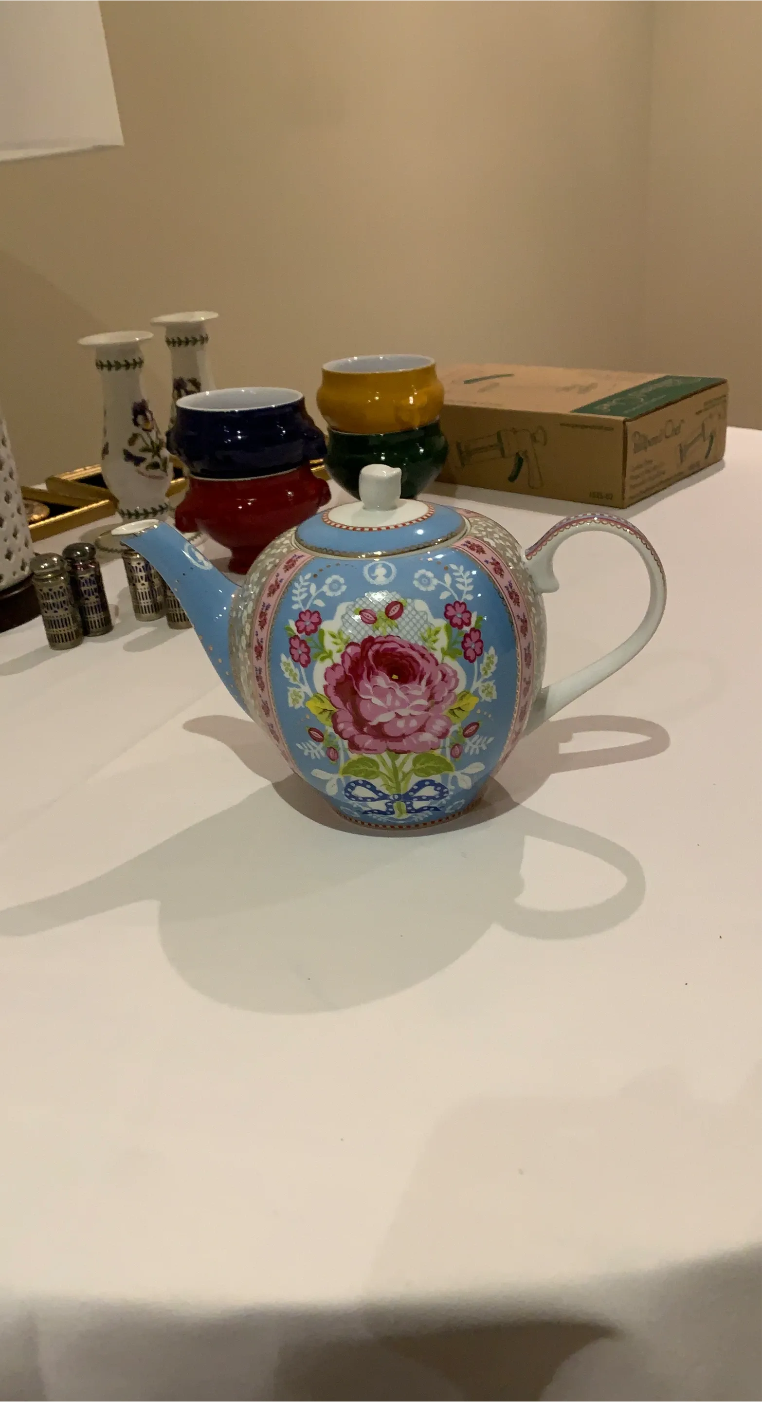 This charming teapot features a lovely blue base with a vibrant pink rose and floral design. Its spout and handle are a crisp white. It's perfect for serving tea during afternoon gatherings. Material appears to be ceramic.