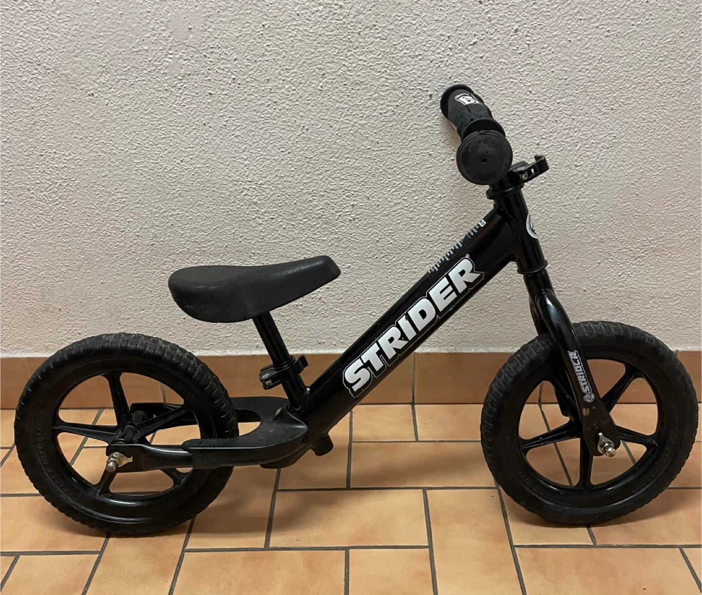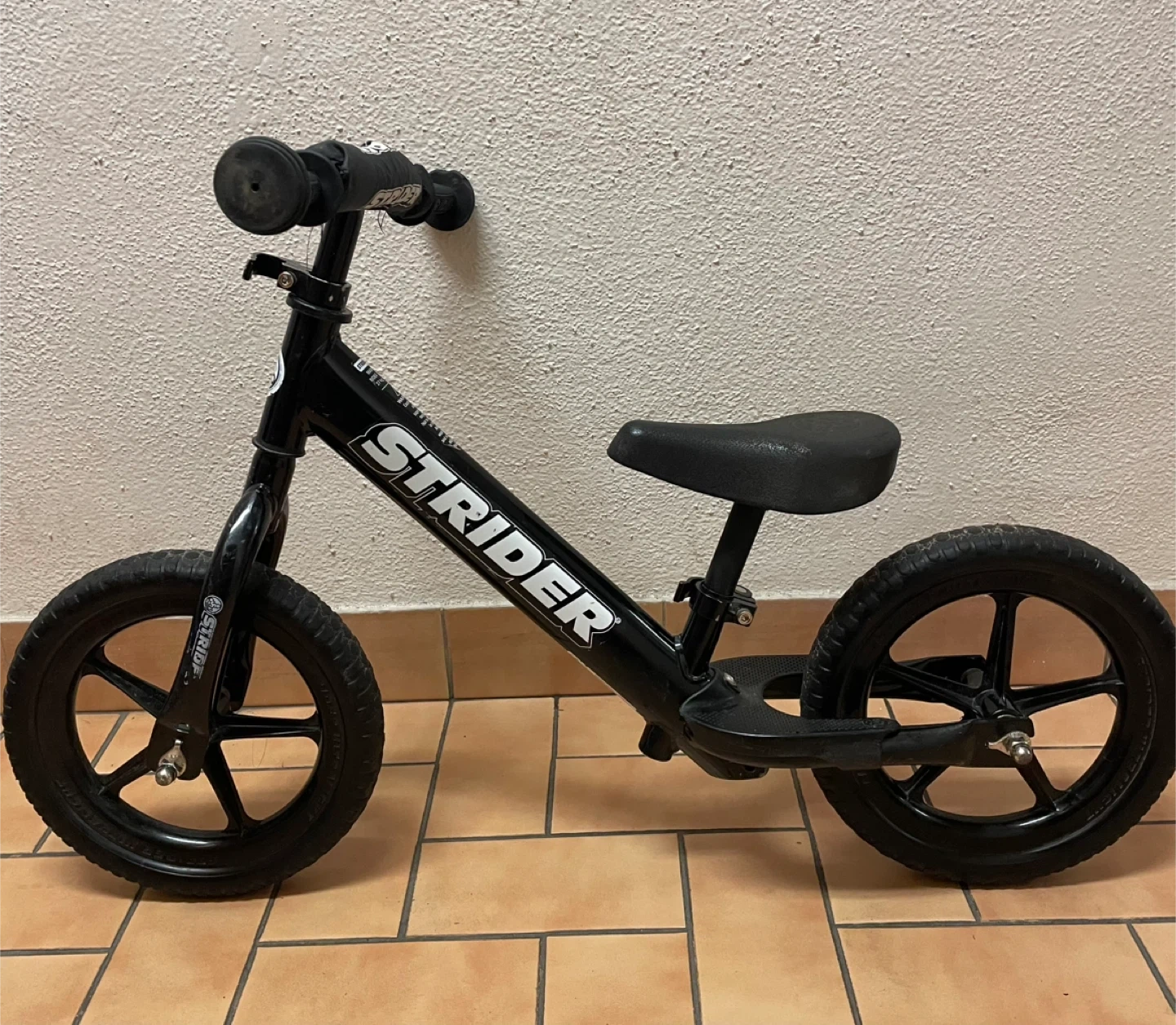 This black Strider balance bike is a great way to help kids learn to ride. It features durable wheels and a comfortable seat. It's designed for learning balance and coordination.