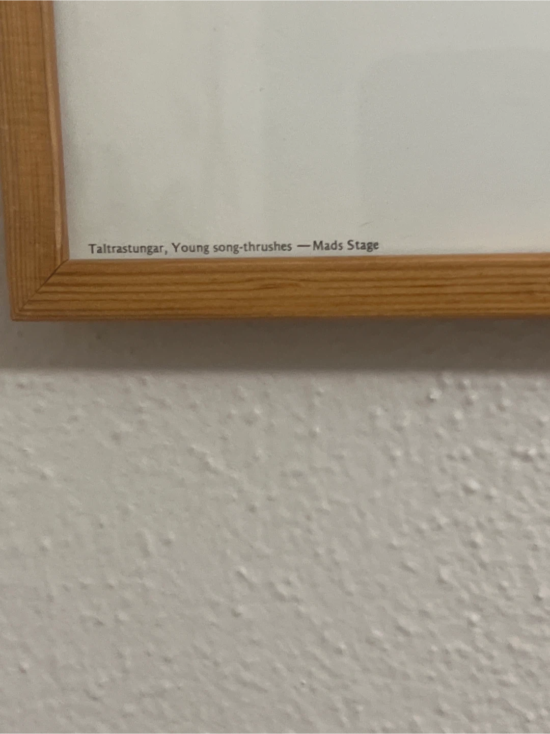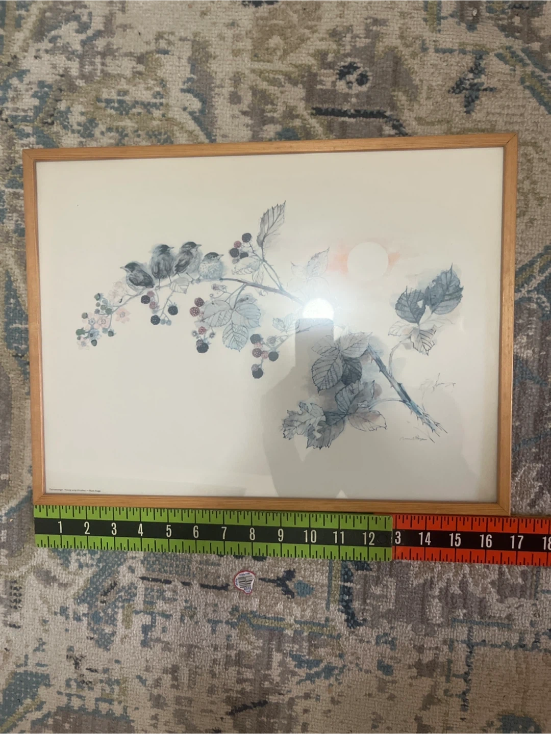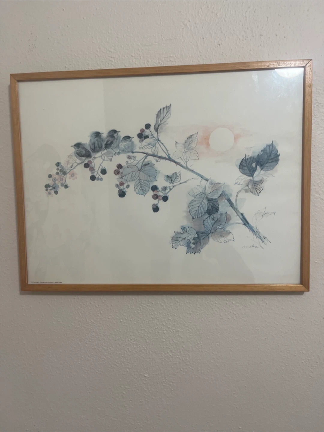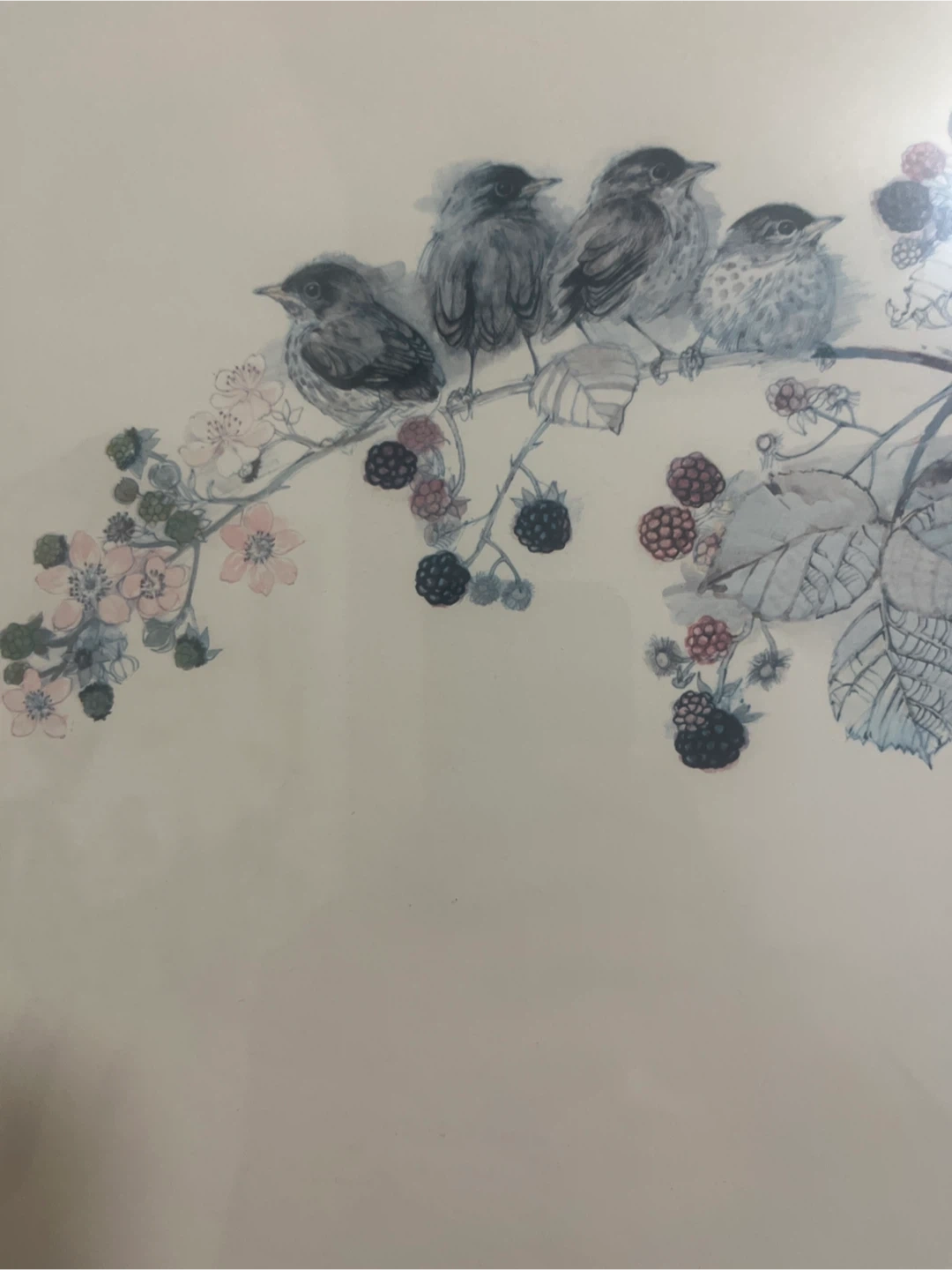 A charming watercolour print featuring a group of young birds perched on a branch with berries. It's housed in a simple wooden frame. This print would add a touch of nature to any room.