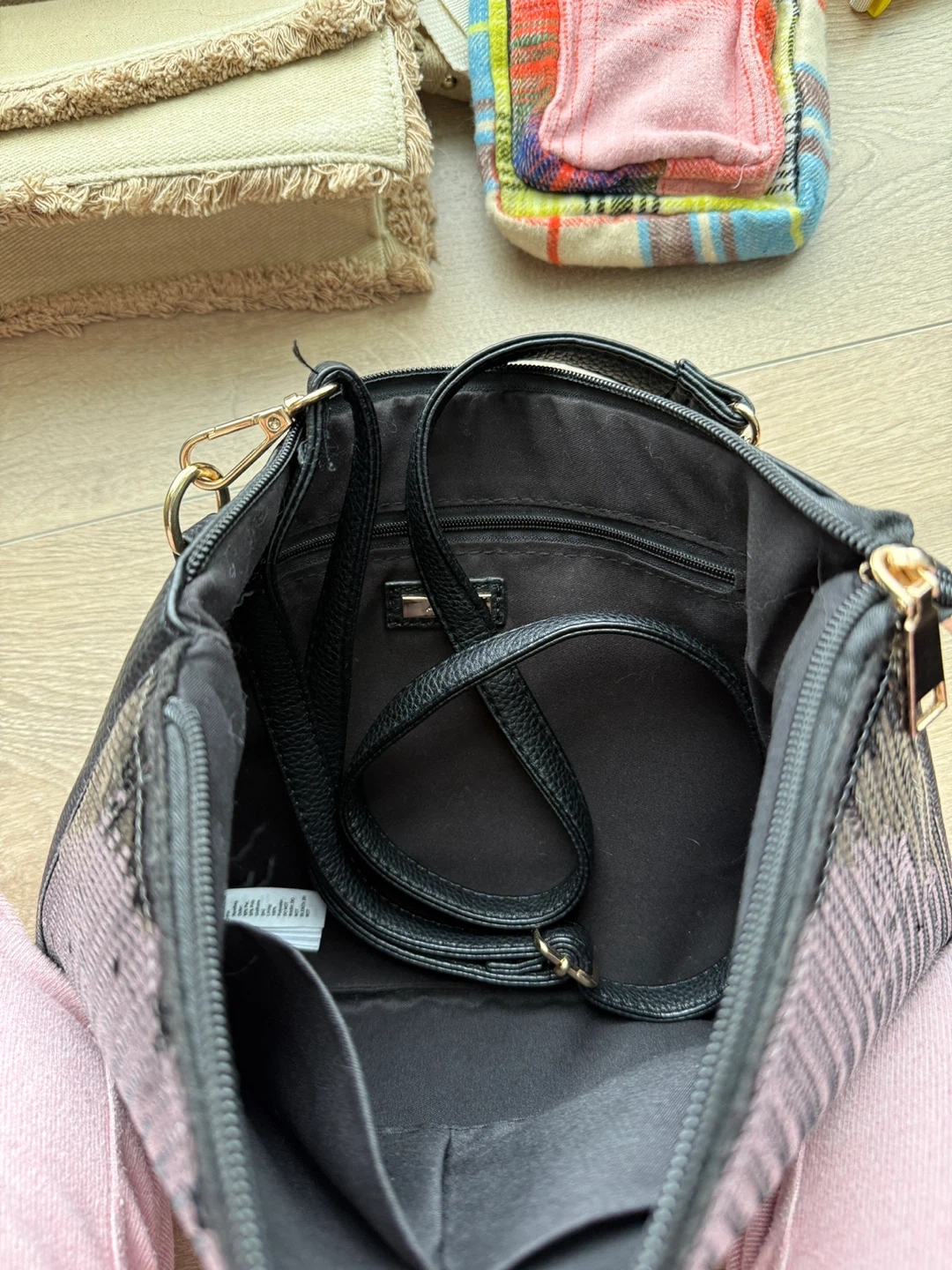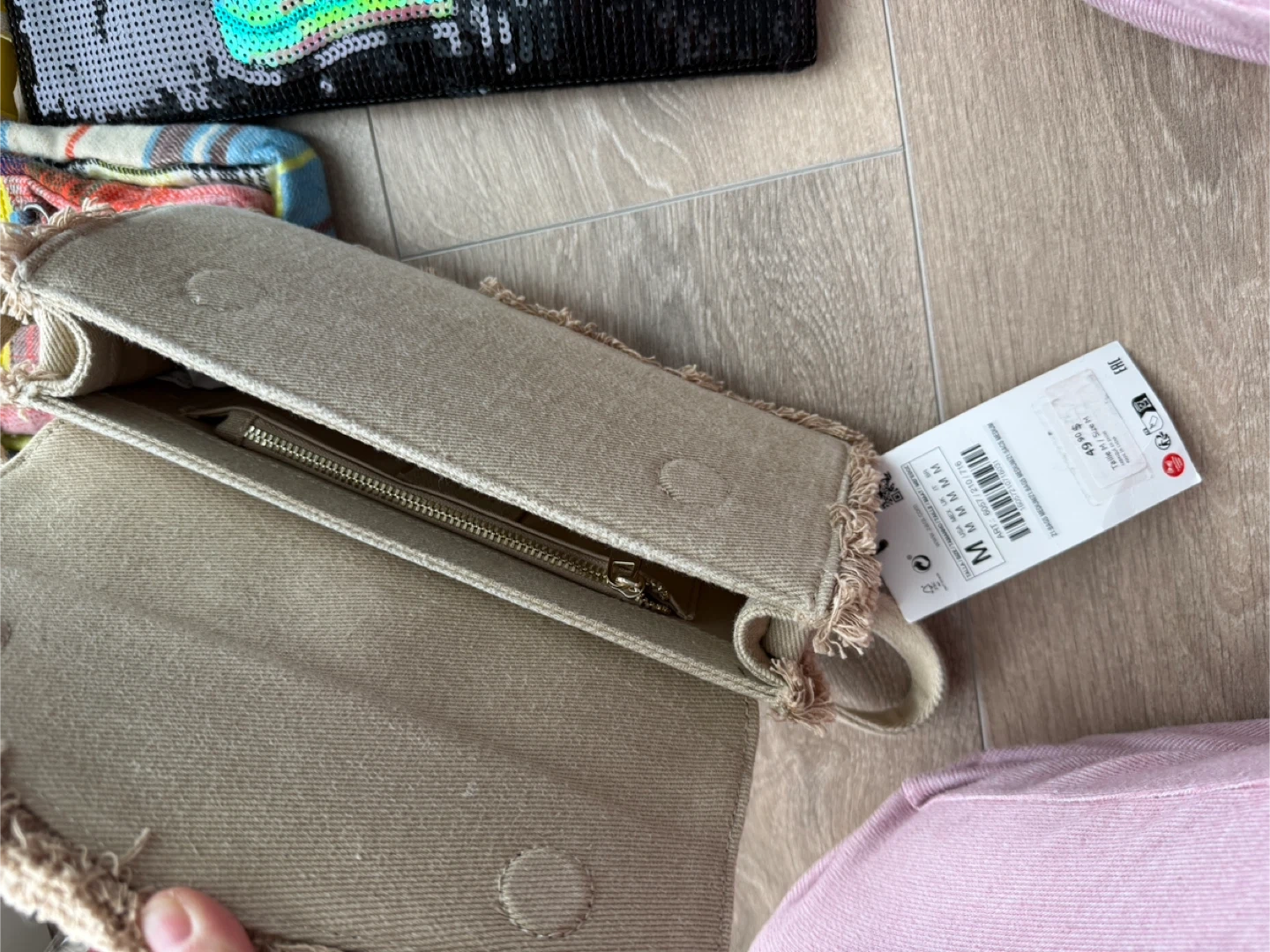 One is a beige crossbody bag from Zara. It features a fringed detail and a zippered main compartment.