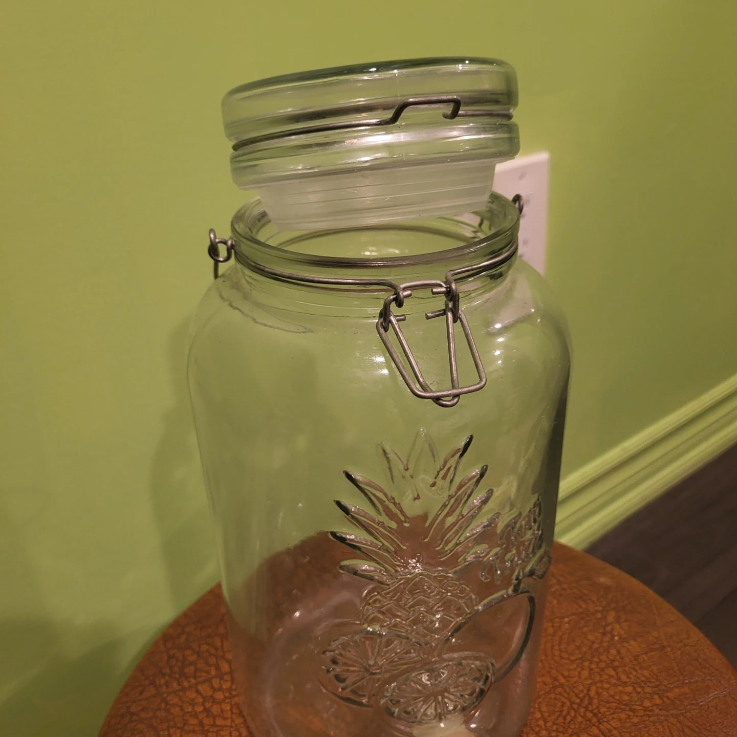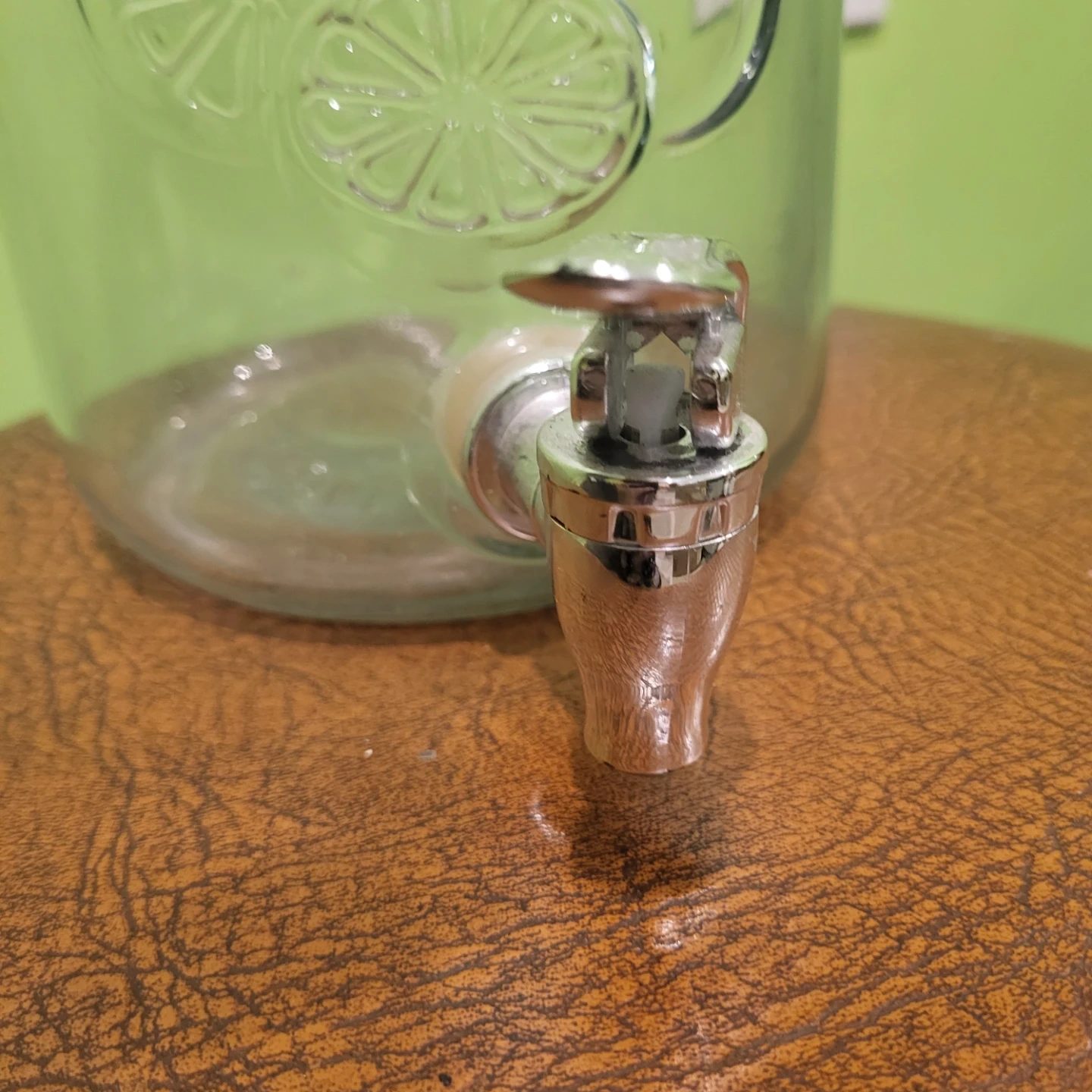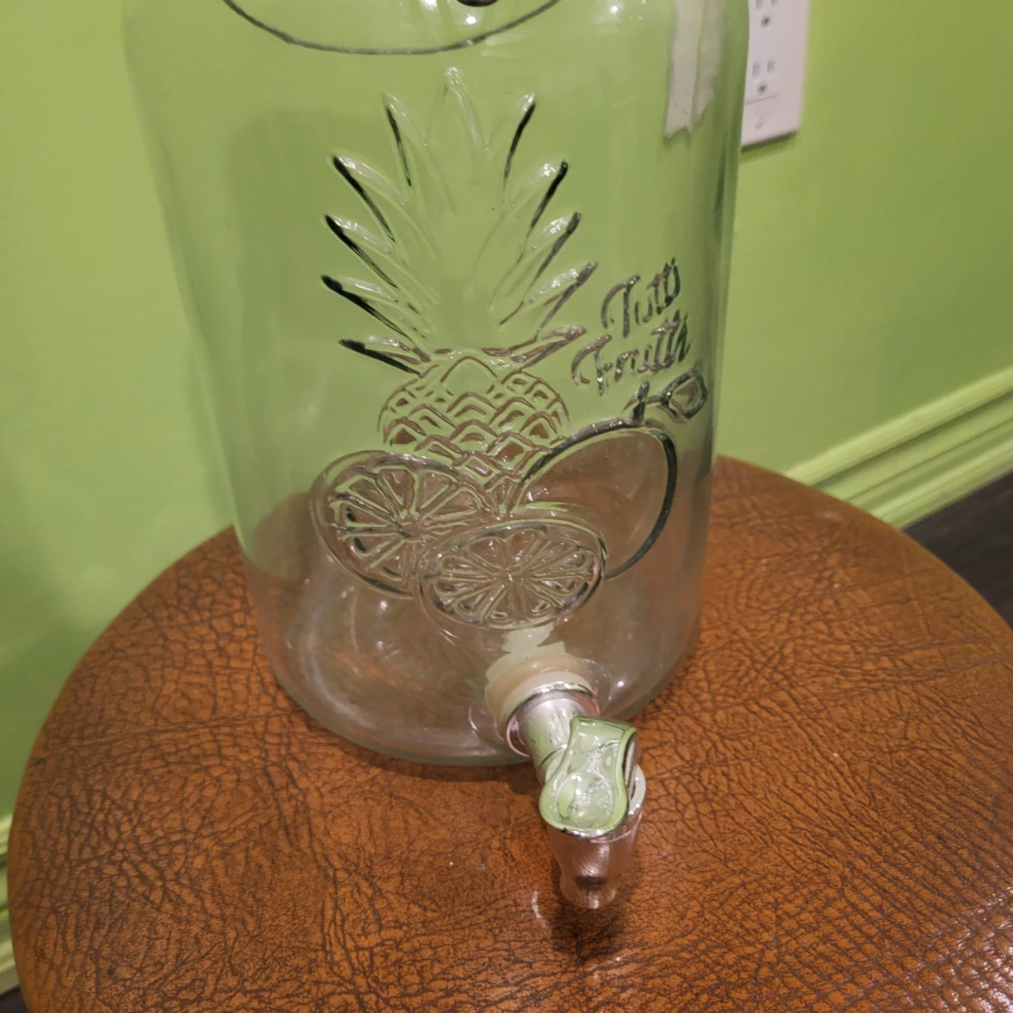 This large glass beverage dispenser has a flip-top lid and a spigot. It features embossed fruit designs, including pineapples and citrus slices. Great for serving drinks at parties or gatherings!