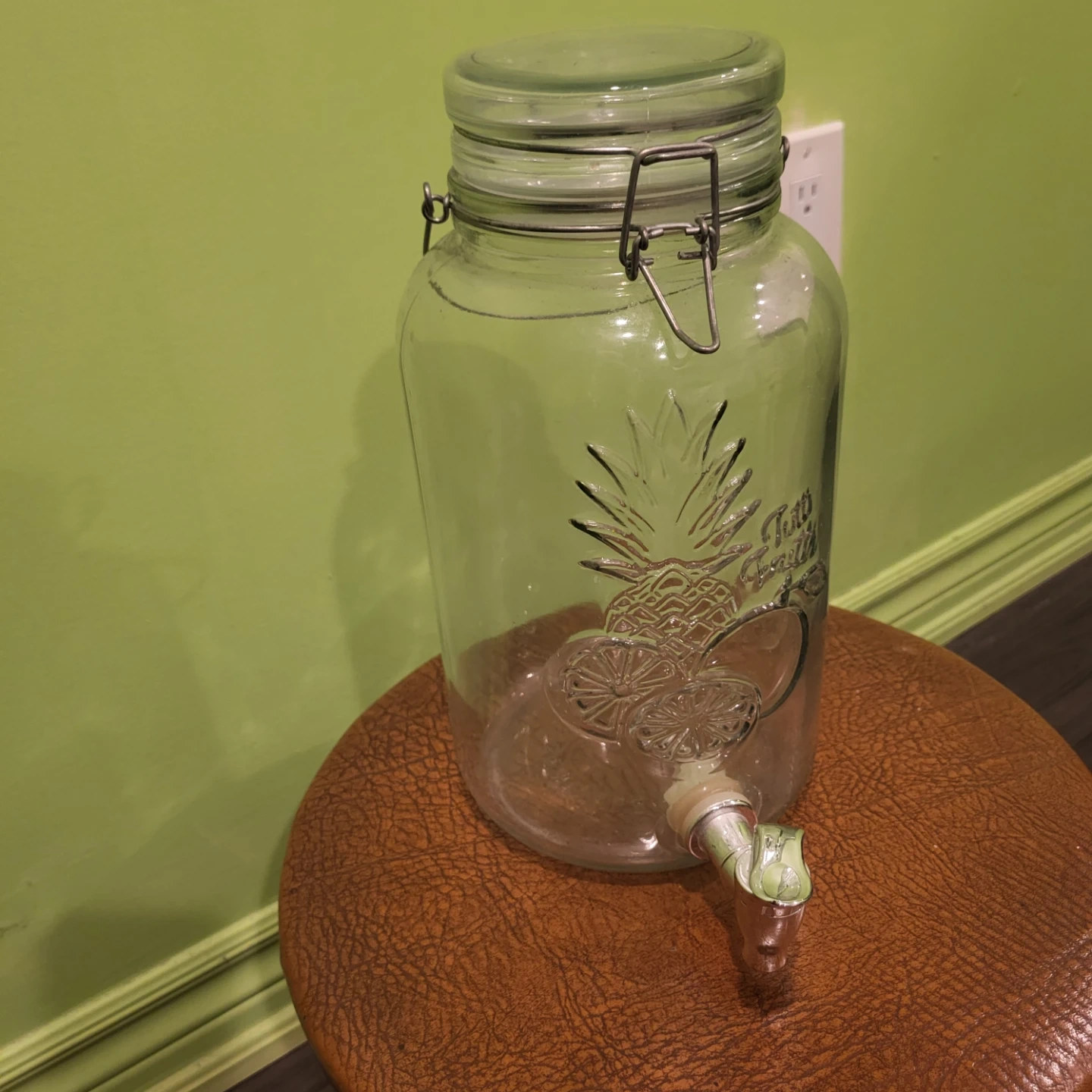 This large glass beverage dispenser has a flip-top lid and a spigot. It features embossed fruit designs, including pineapples and citrus slices. Great for serving drinks at parties or gatherings!
