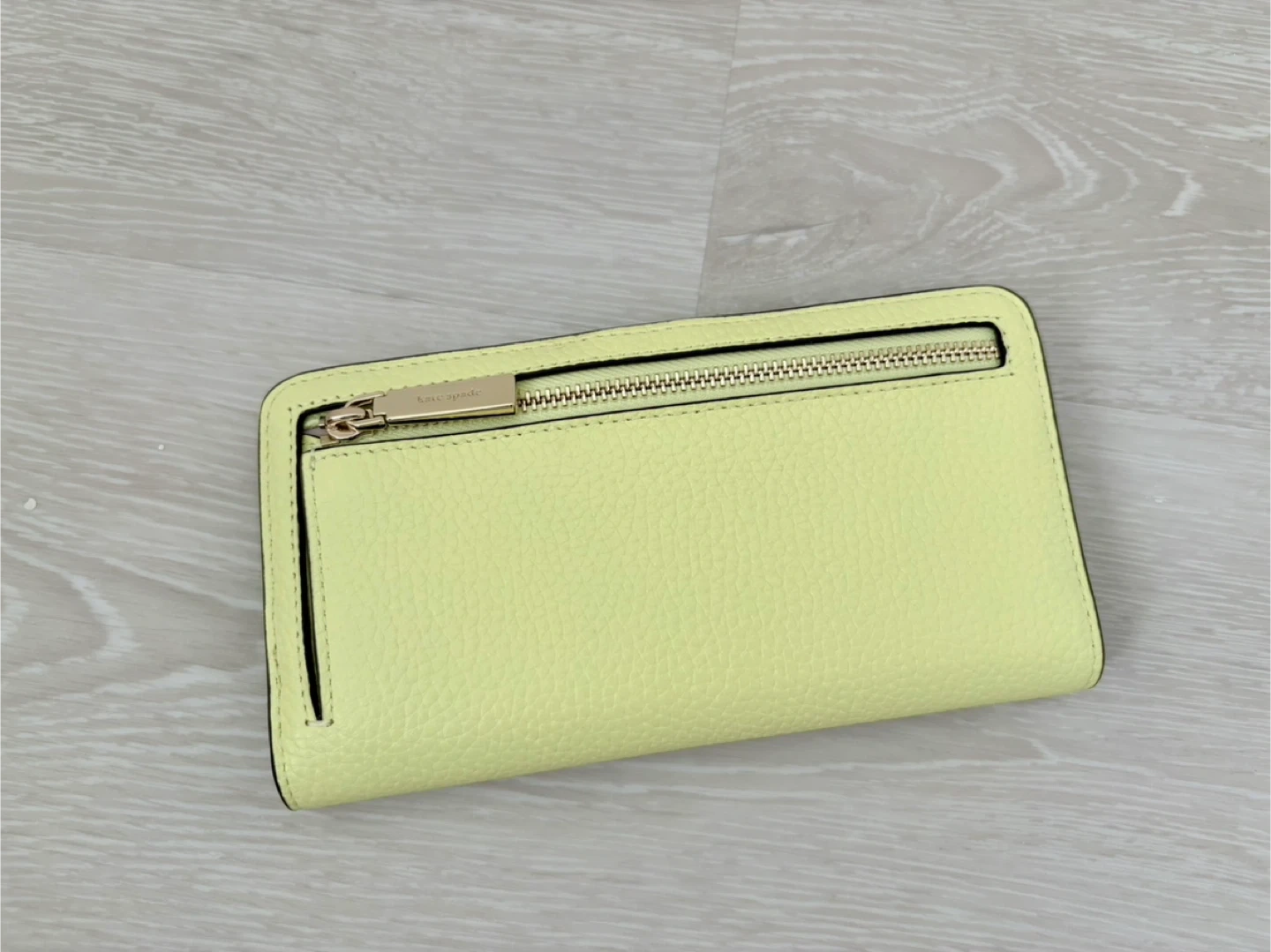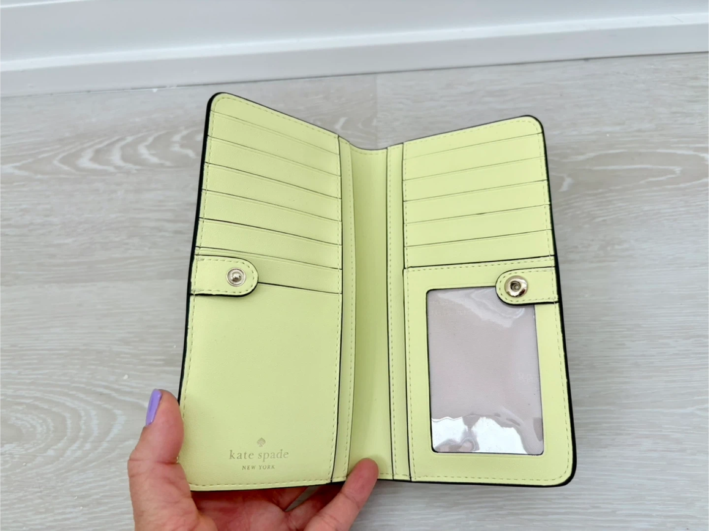 Brand new Kate Spade wallet in a light yellow pebbled leather. It features multiple card slots, a clear ID window, and a zip-around coin pocket.