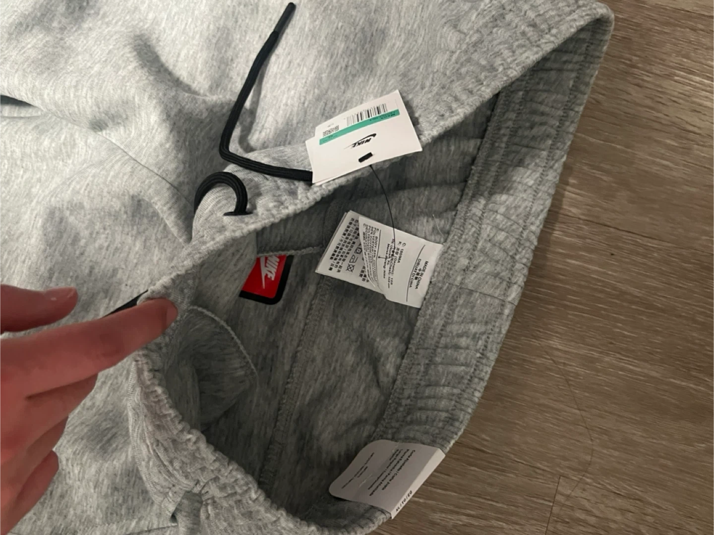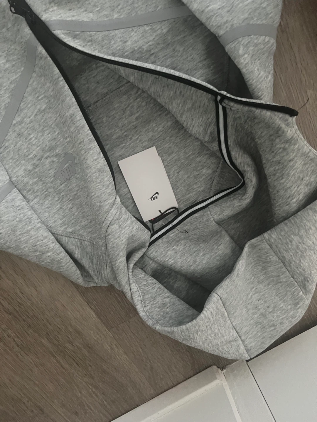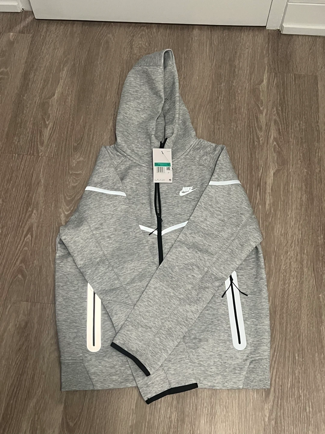 This is a Nike Tech Fleece set featuring a grey full zip hoodie and matching joggers. Both pieces are made with a soft fleece material and have zippered pockets. The set includes reflective detailing for added visibility.