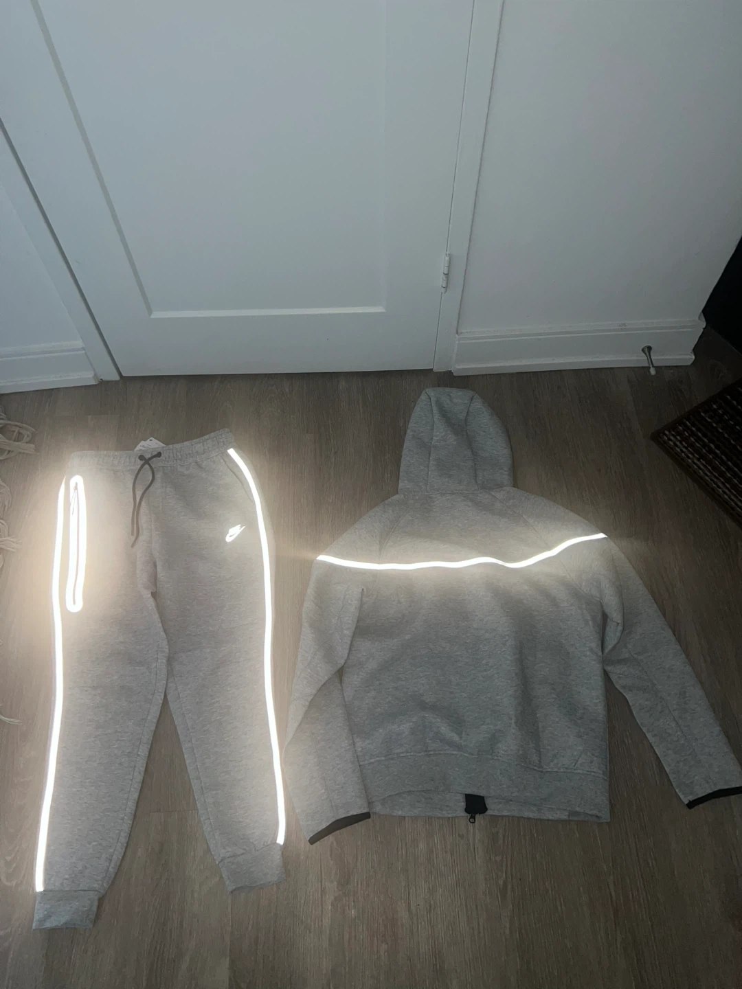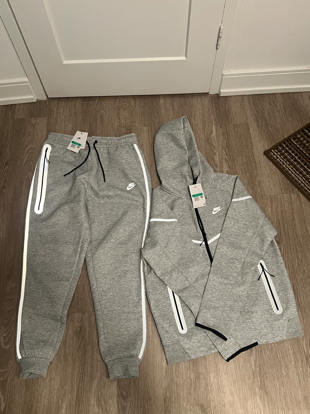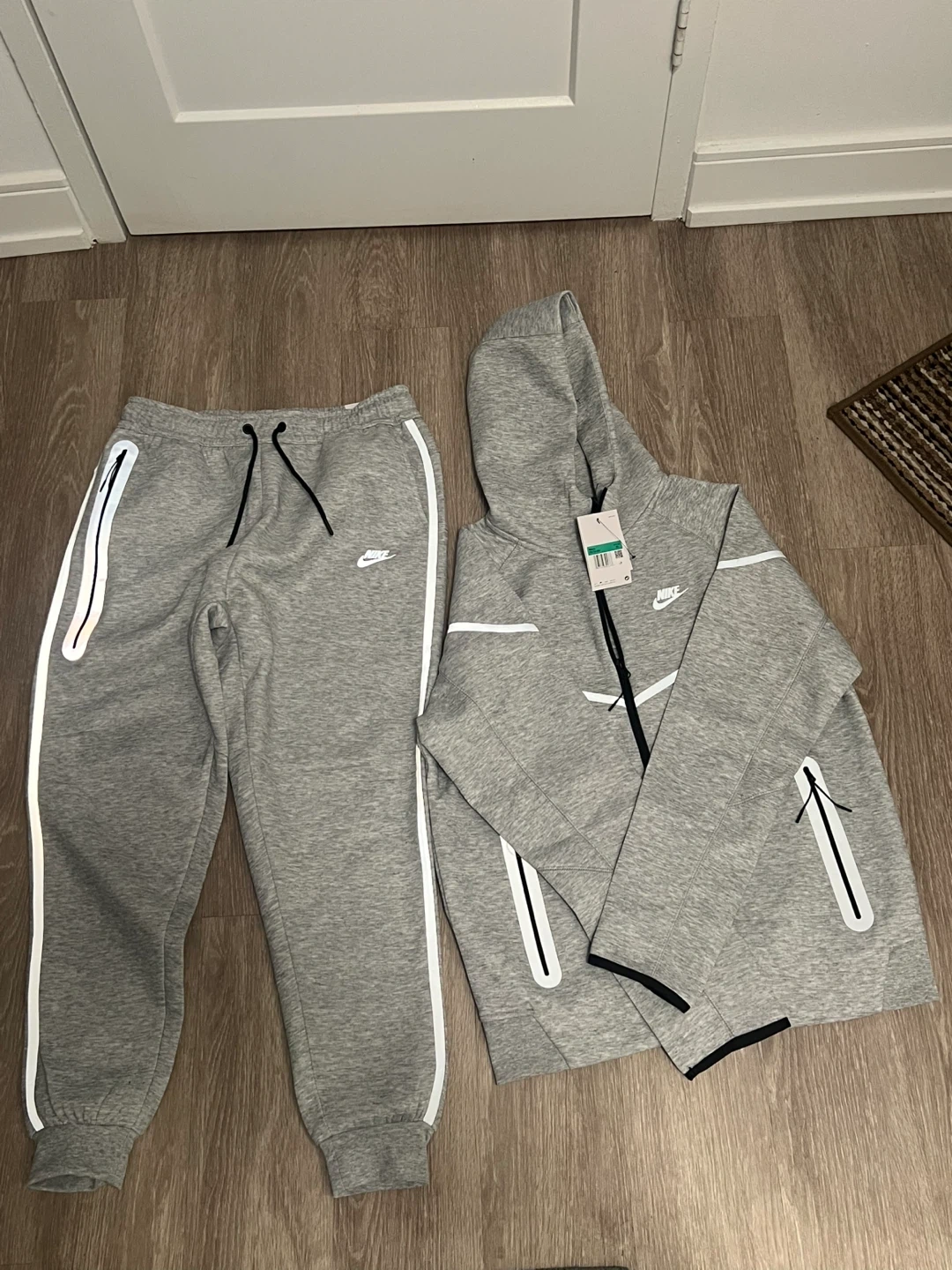 This is a Nike Tech Fleece set featuring a grey full zip hoodie and matching joggers. Both pieces are made with a soft fleece material and have zippered pockets. The set includes reflective detailing for added visibility.