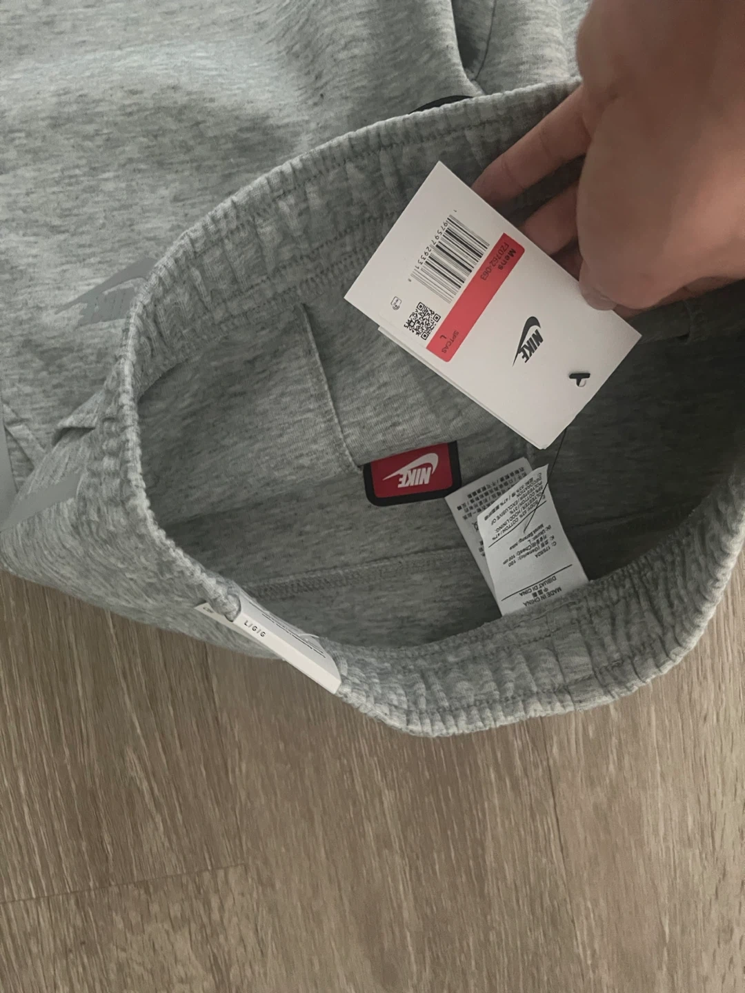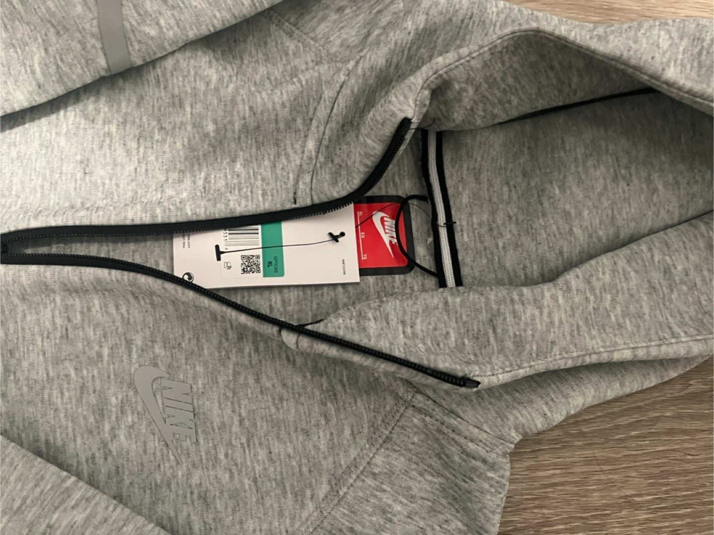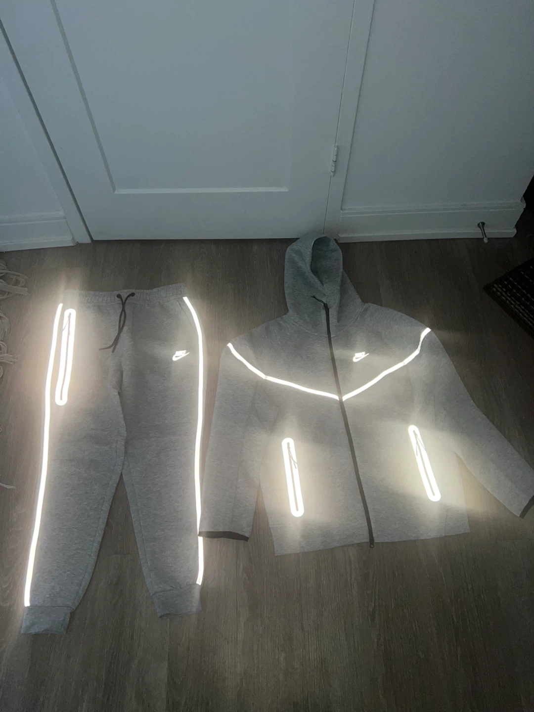 This is a Nike Tech Fleece set featuring a grey full zip hoodie and matching joggers. Both pieces are made with a soft fleece material and have zippered pockets. The set includes reflective detailing for added visibility.