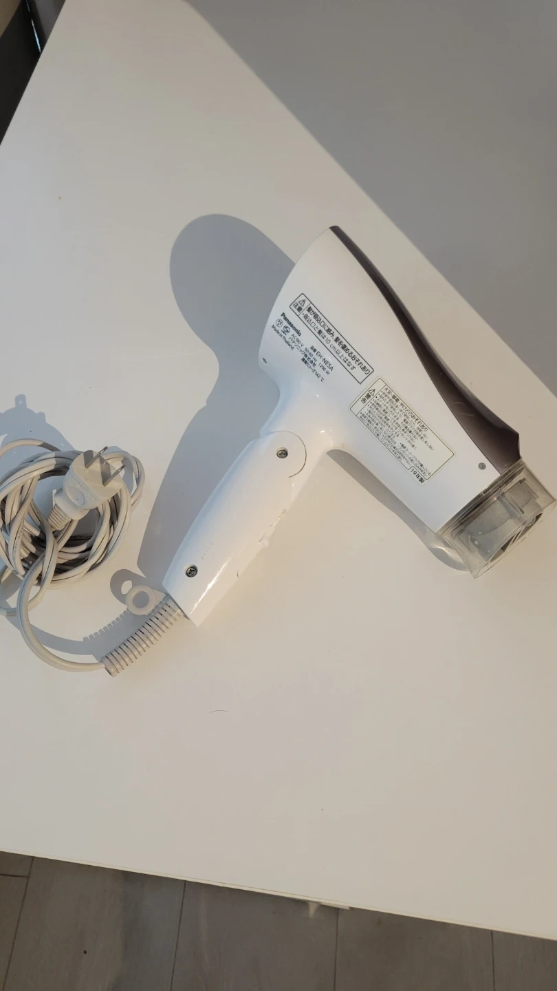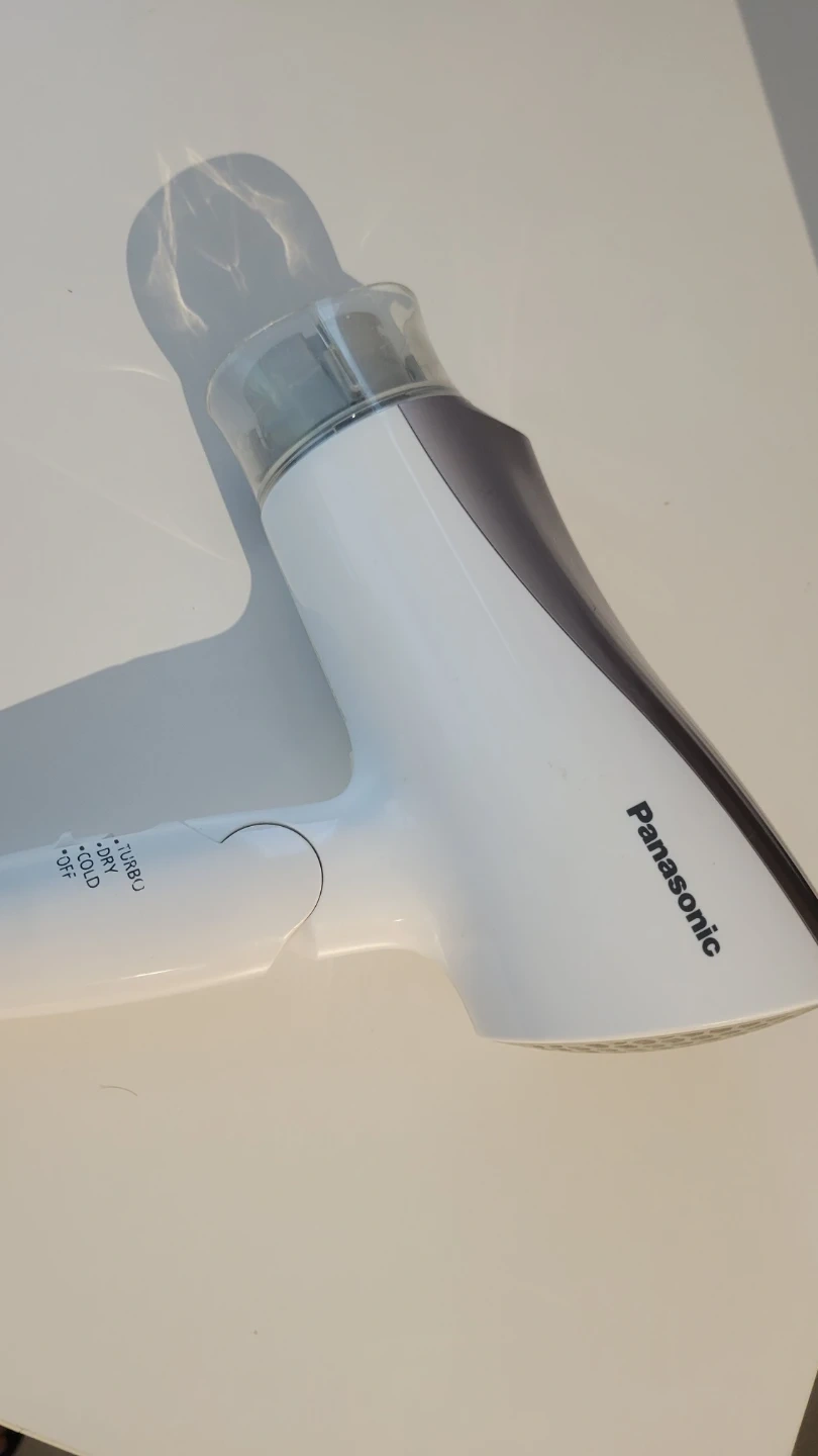 White Panasonic EH-NE5A hair dryer with multiple heat settings including Turbo, Dry, and Cool. It's a 1200W. This dryer is suitable for everyday hair drying needs. Leaves the hair shiny with positive ions