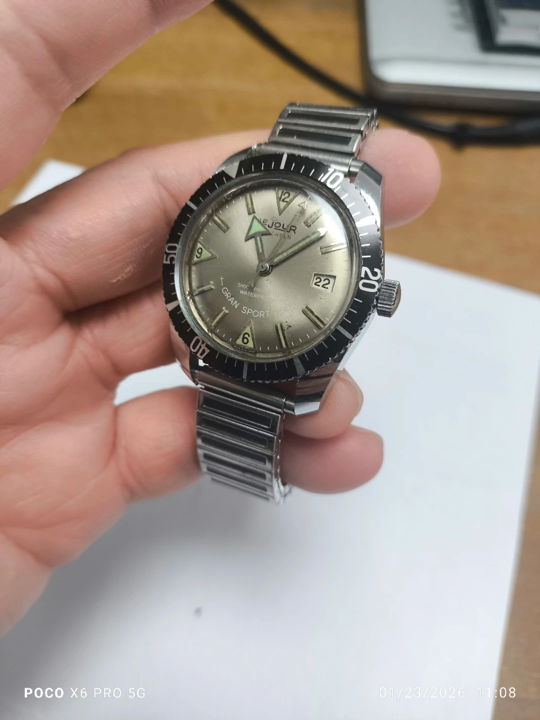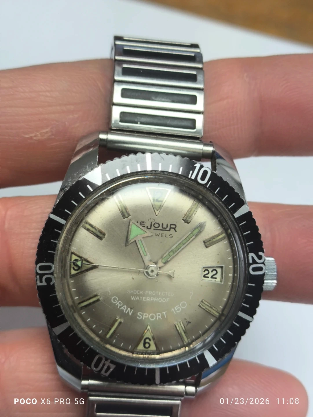 This is a vintage Le Jour Gran Sport 150 automatic watch. It features a stainless steel band and a rotating bezel. The dial shows "Shock Protected" and "Waterproof" markings.
