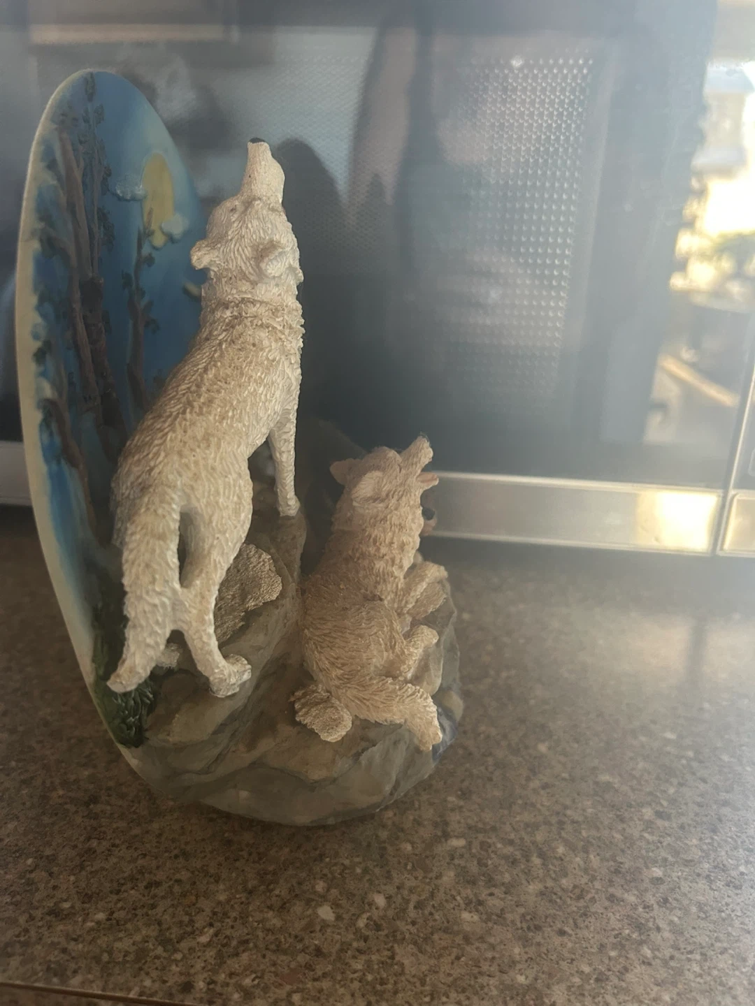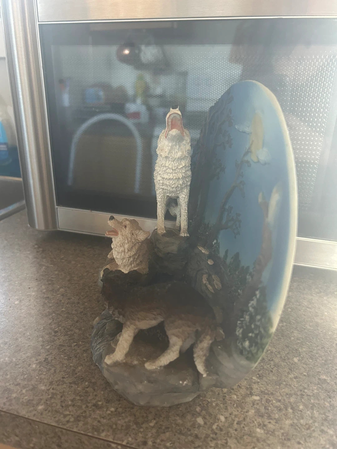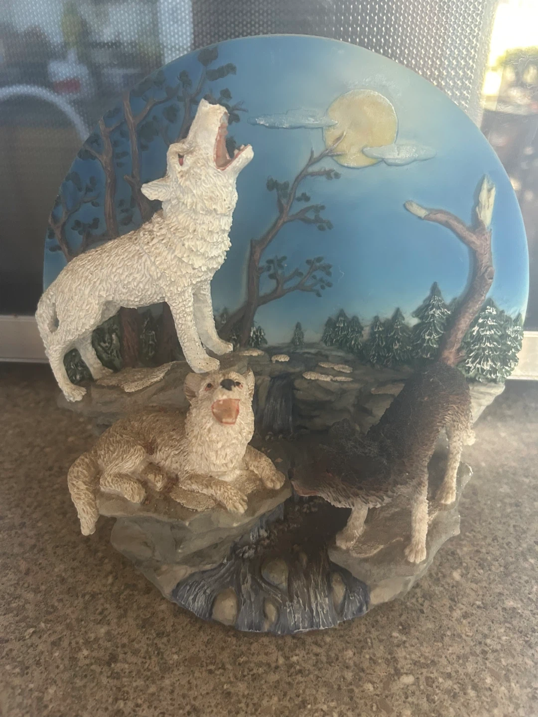 This detailed figurine features three wolves howling at the moon in a scenic landscape with trees and a waterfall. . It looks great on a shelf or mantelpiece!