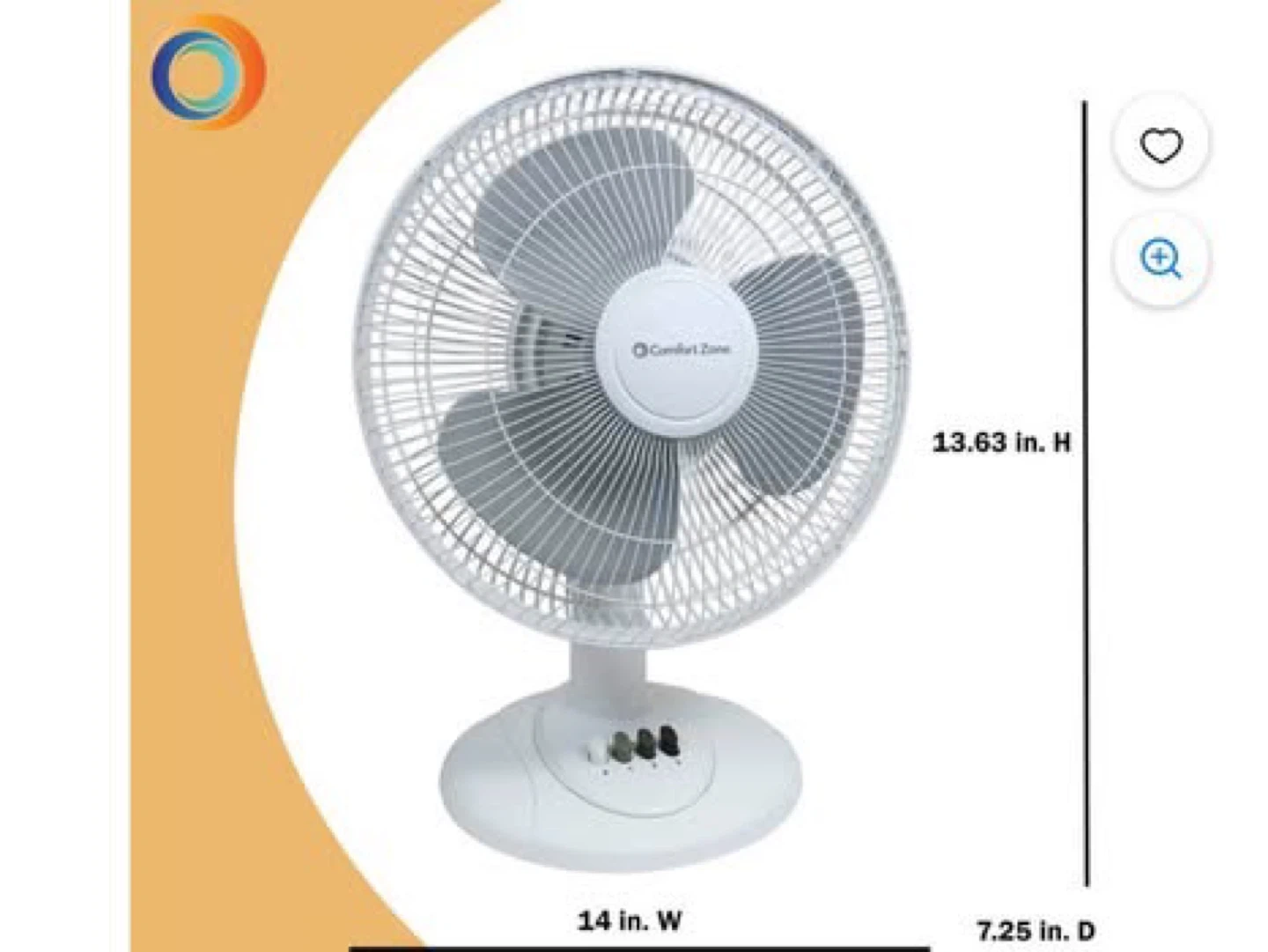 This is a white Comfort Zone table fan. It measures 14 inches wide, 13.63 inches high, and 7.25 inches deep. It has multiple speed settings.