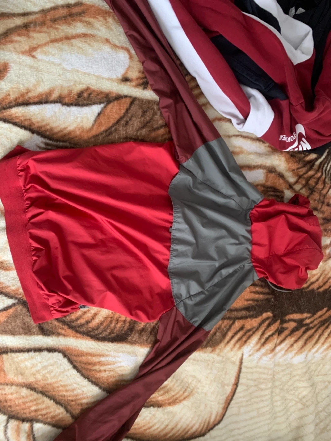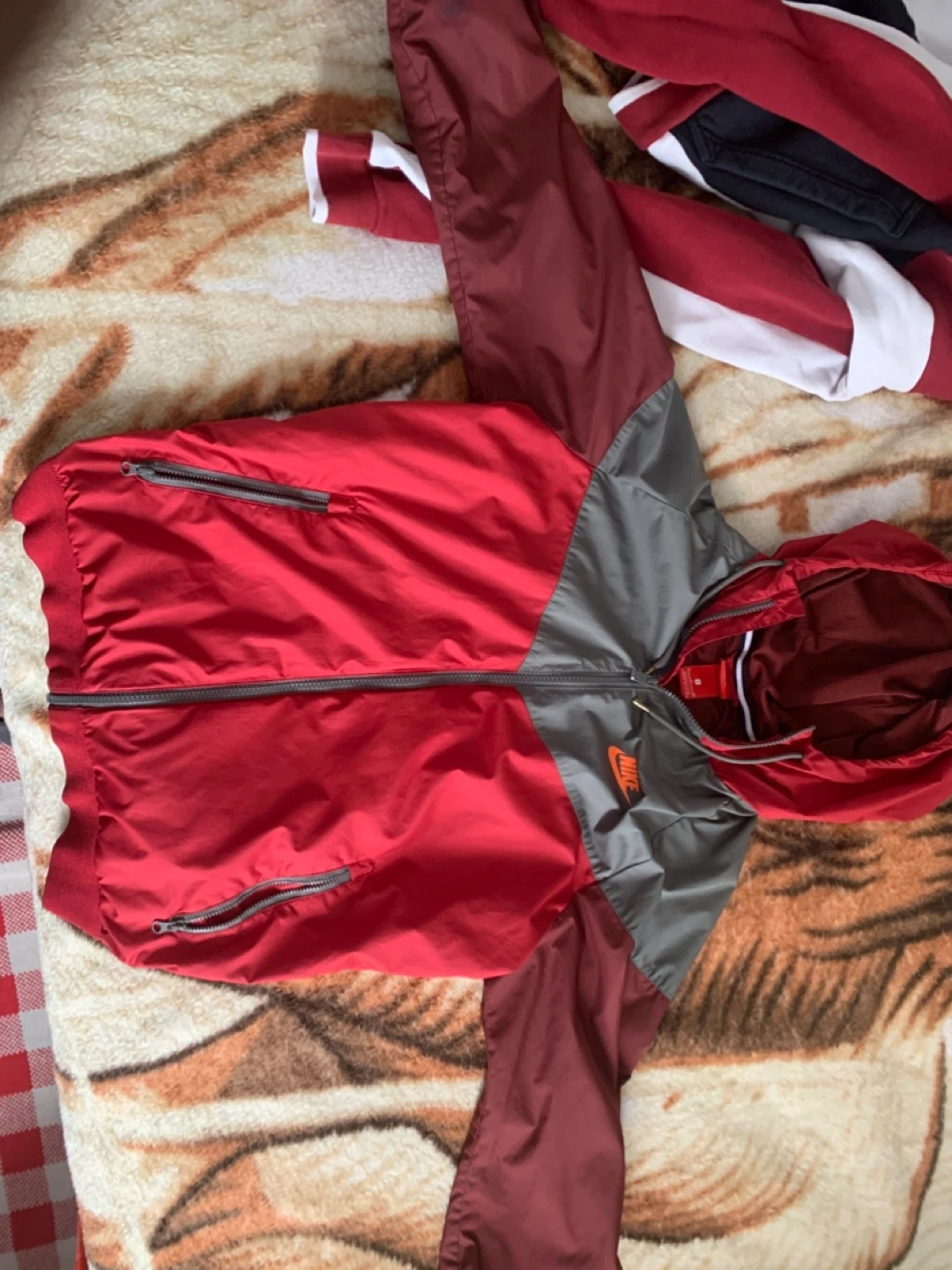 This is a Nike hooded windbreaker jacket in red and grey. It features a full zip closure and two zippered hand pockets. This lightweight jacket is suitable for casual wear or outdoor activities.