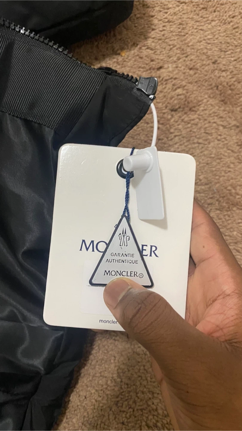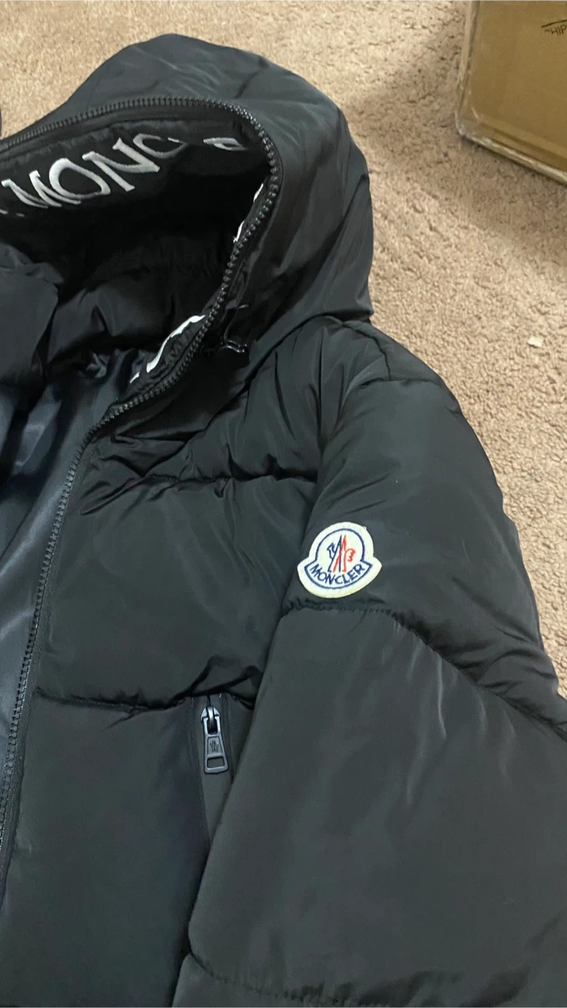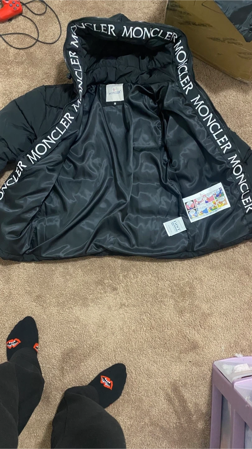 This is a black Moncler puffer jacket. It's filled with down for warmth and features the iconic Moncler logo on the sleeve. The interior lining has repeating Moncler branding. Price is negotiable