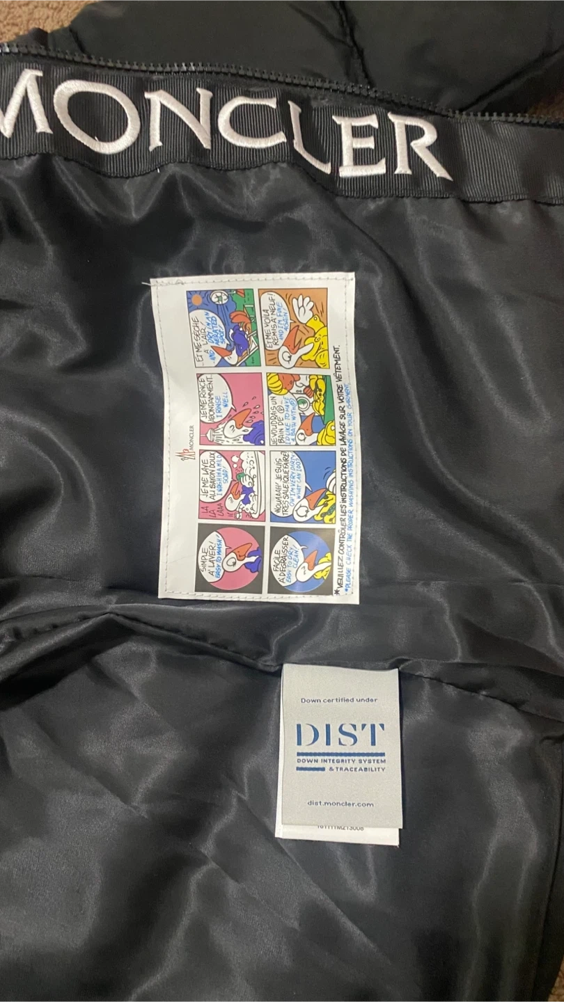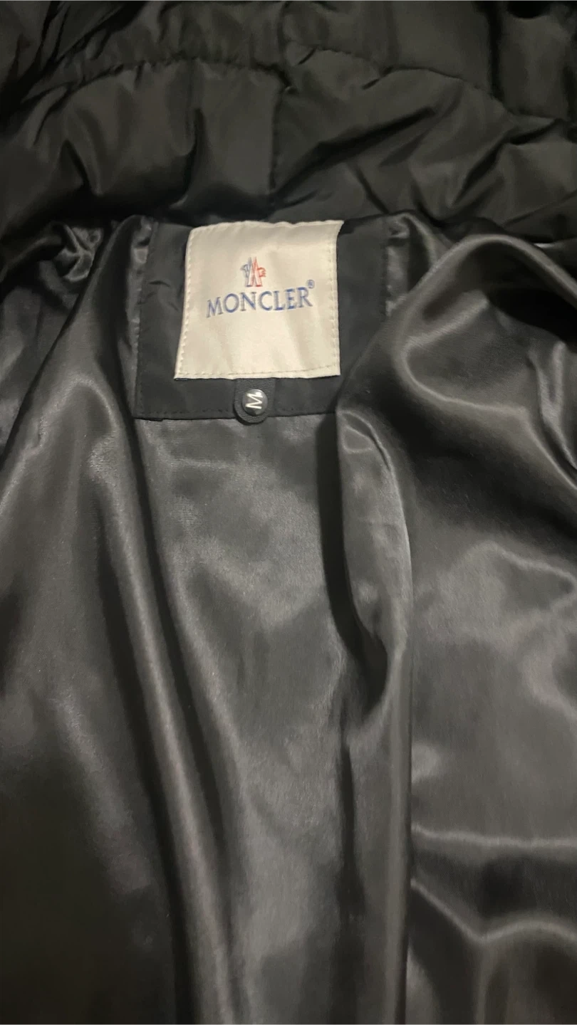 This is a black Moncler puffer jacket. It's filled with down for warmth and features the iconic Moncler logo on the sleeve. The interior lining has repeating Moncler branding. Price is negotiable