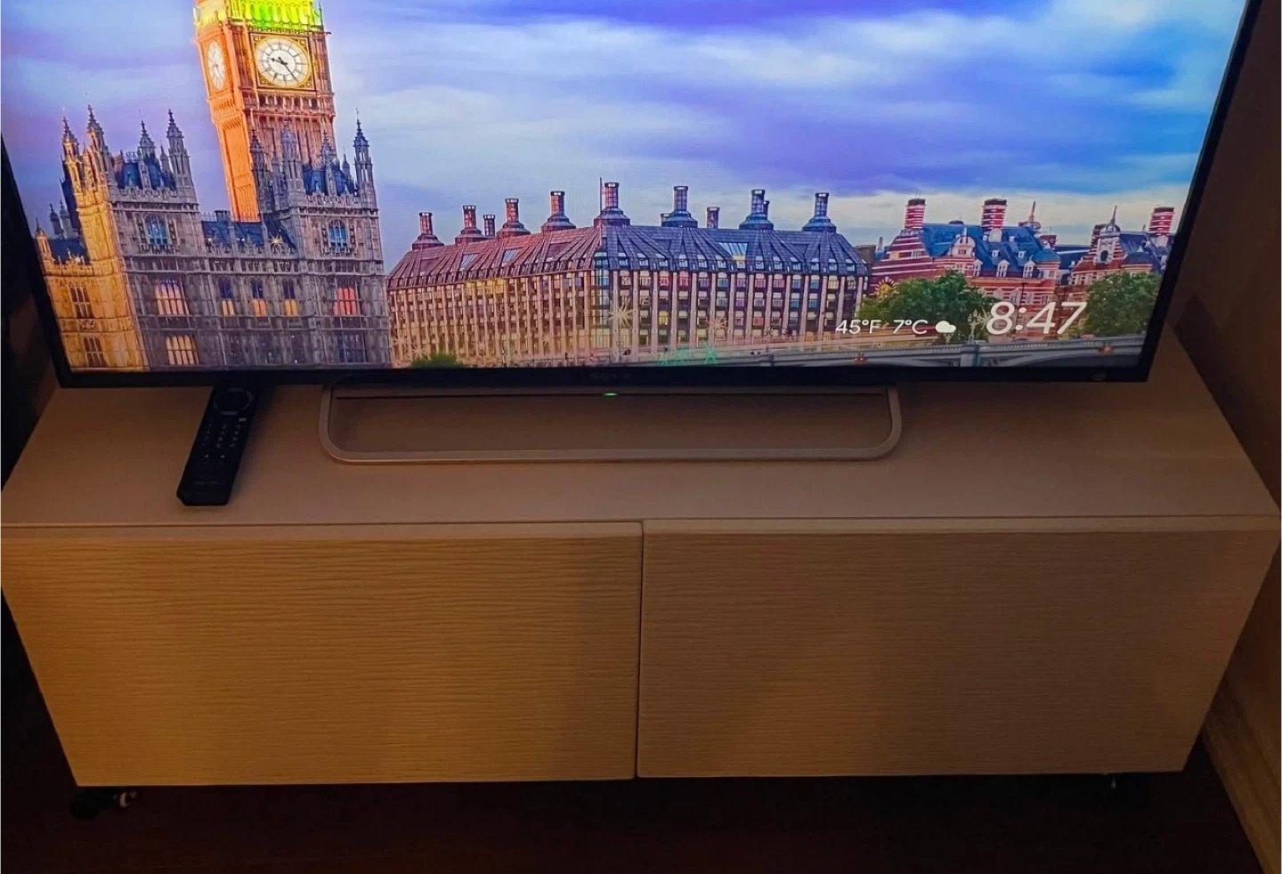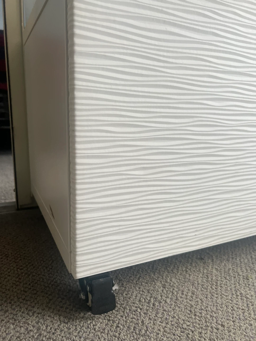 This unit features a modern textured front and casters for easy mobility. It has two cabinet doors for storage. Its clean design suits various living spaces.