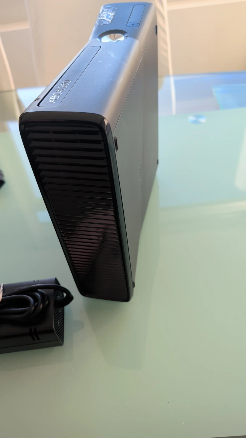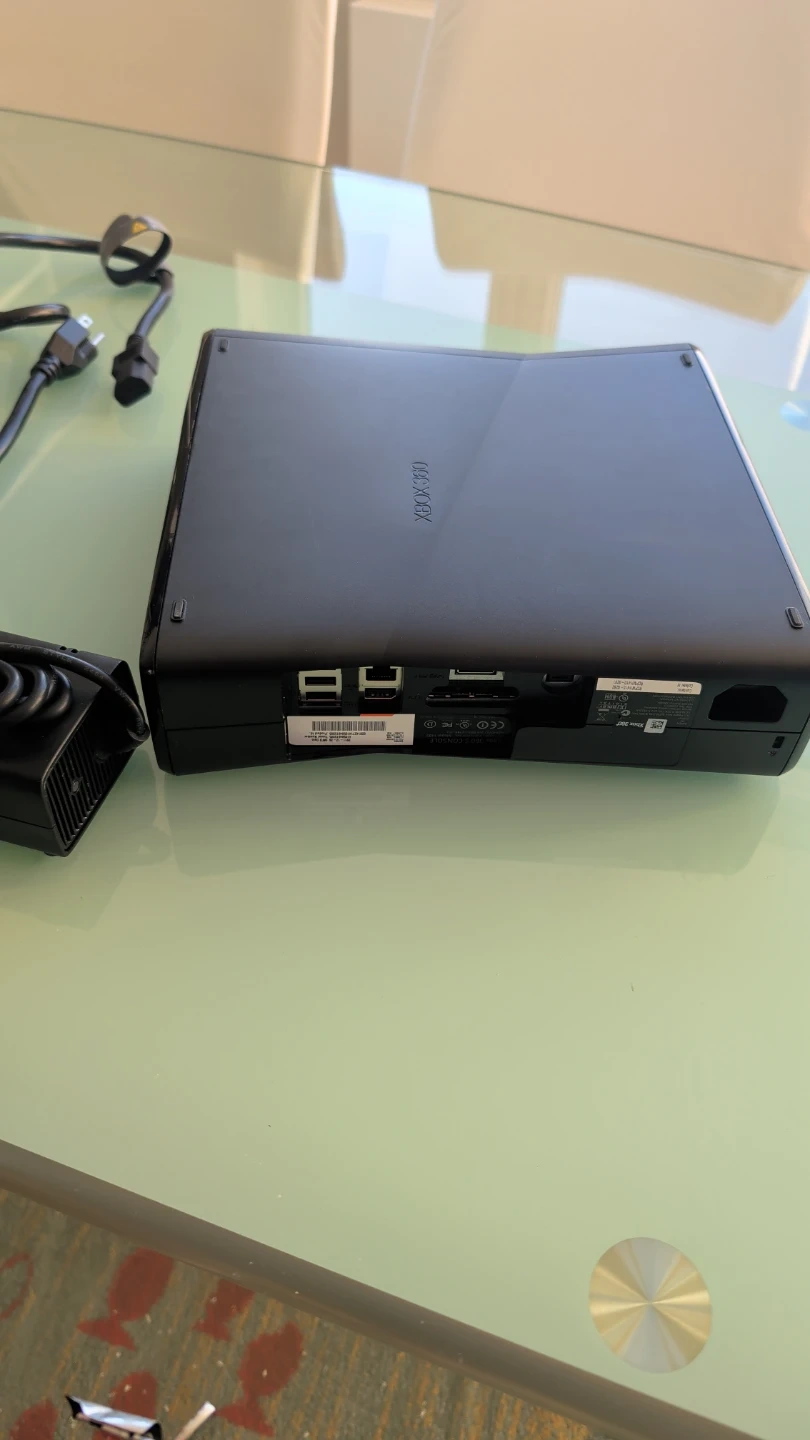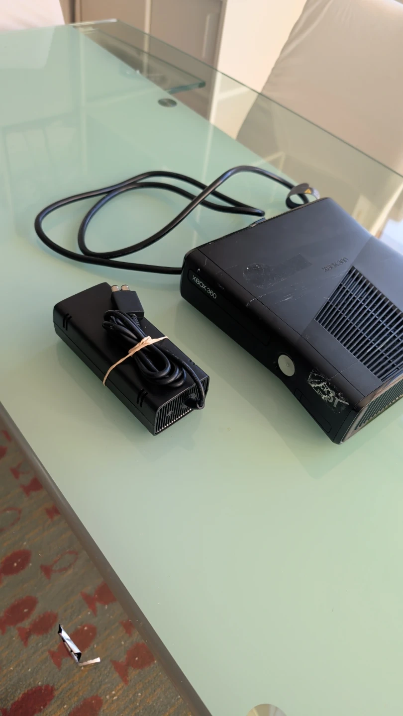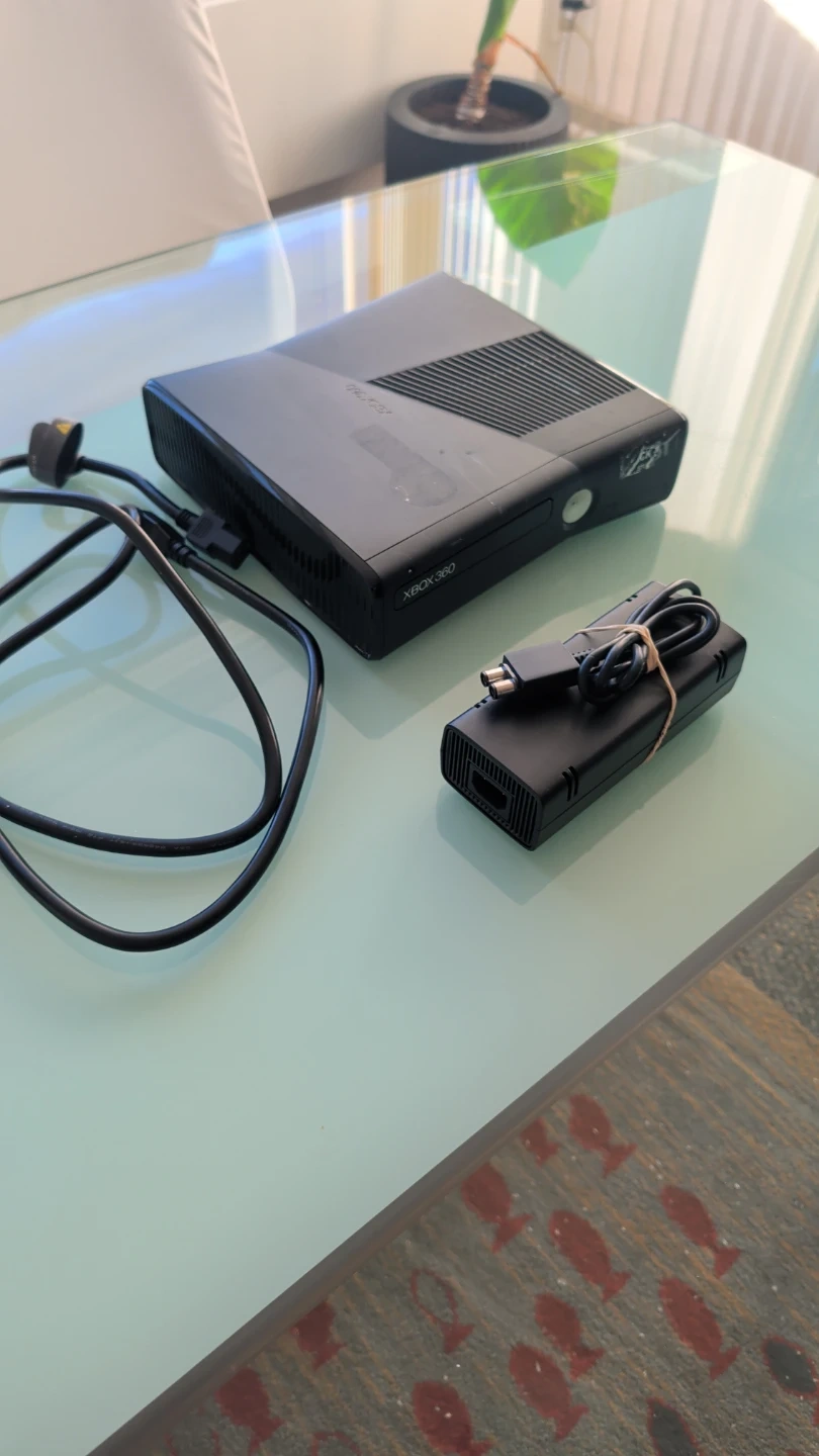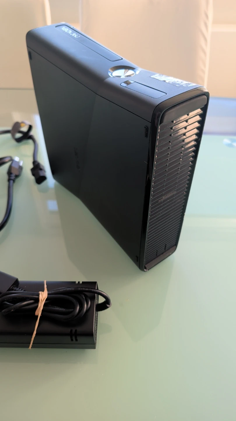 This is a black Xbox 360 console. It includes the power adapter and necessary cables.
