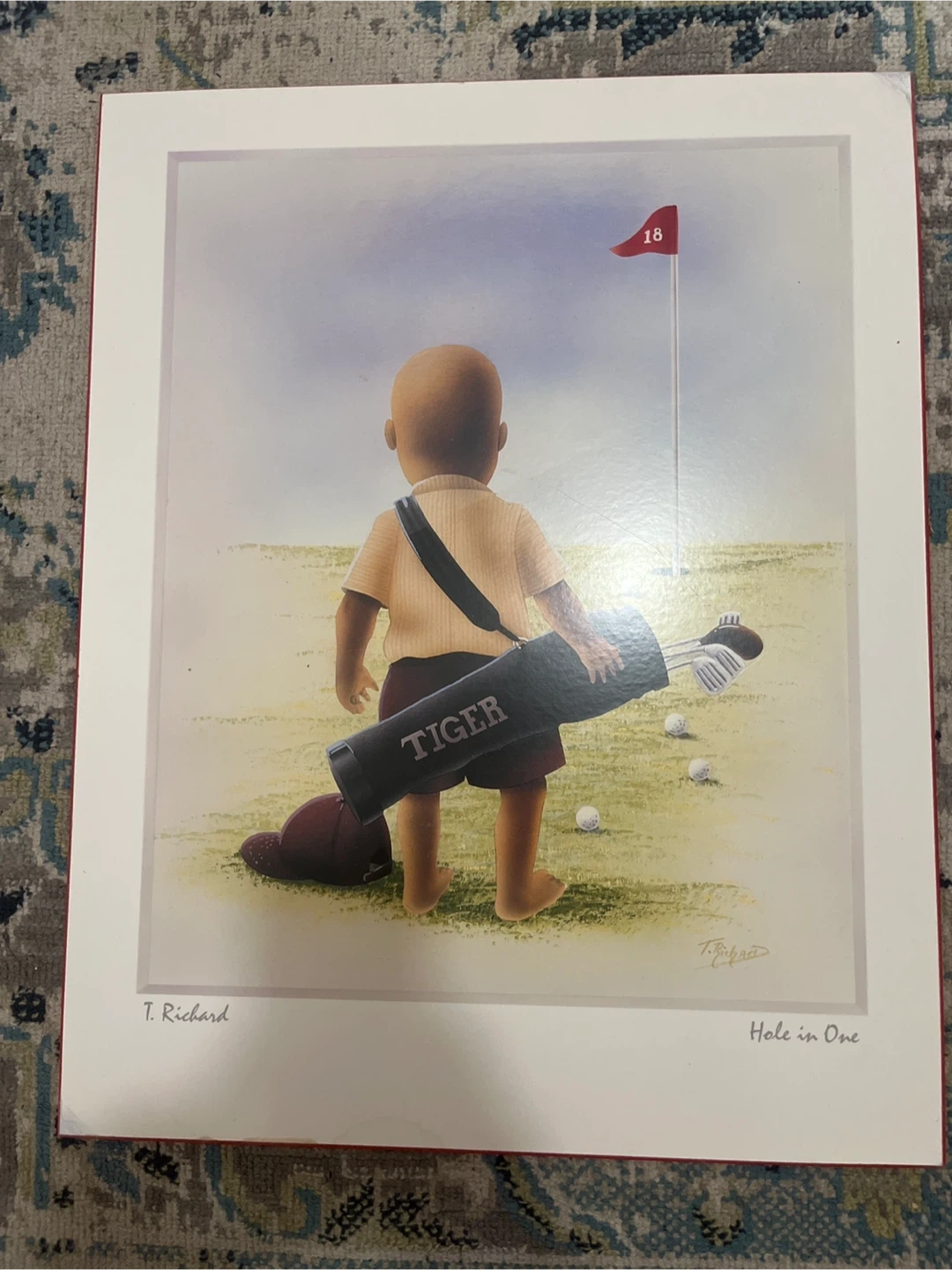 This is a print titled "Hole in One" by artist T. Richard. It depicts a young child with a golf bag labeled "TIGER" on a golf course. The artwork features a red flag with the number 18. A great piece for golf enthusiasts!