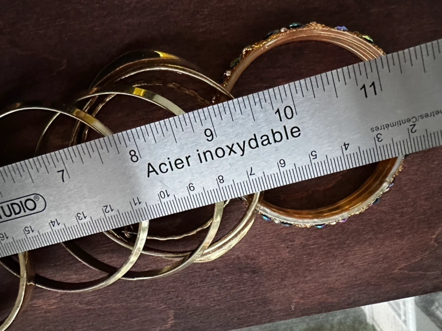 Set of assorted gold-tone bangles, including one decorated bangle with colourful rhinestones. Most bangles appear to be approximately 2.5 inches in diameter. These bracelets add a pop of sparkle to any outfit!
