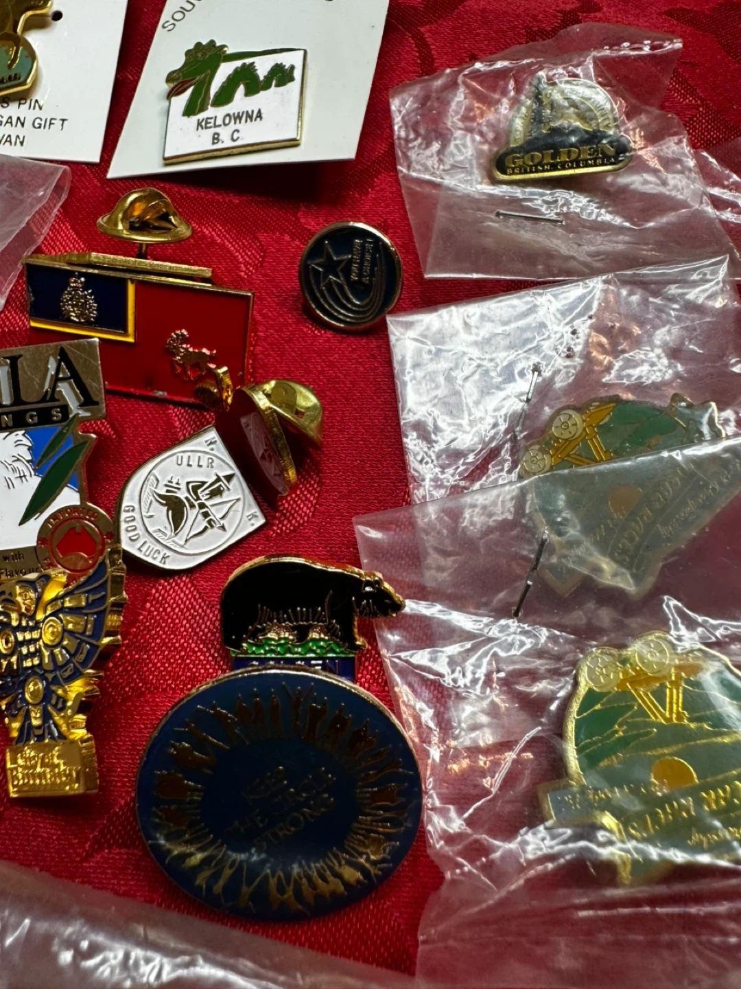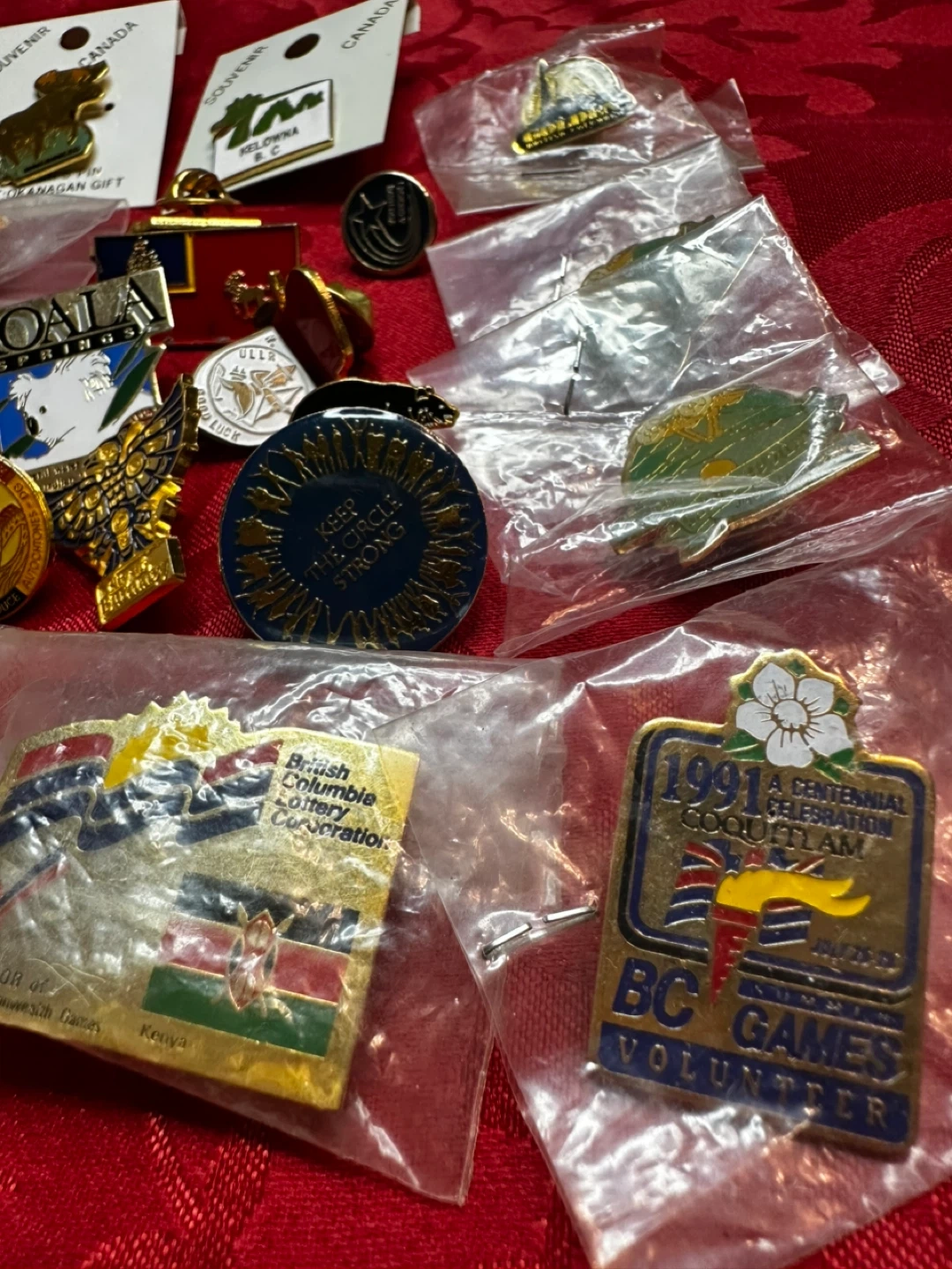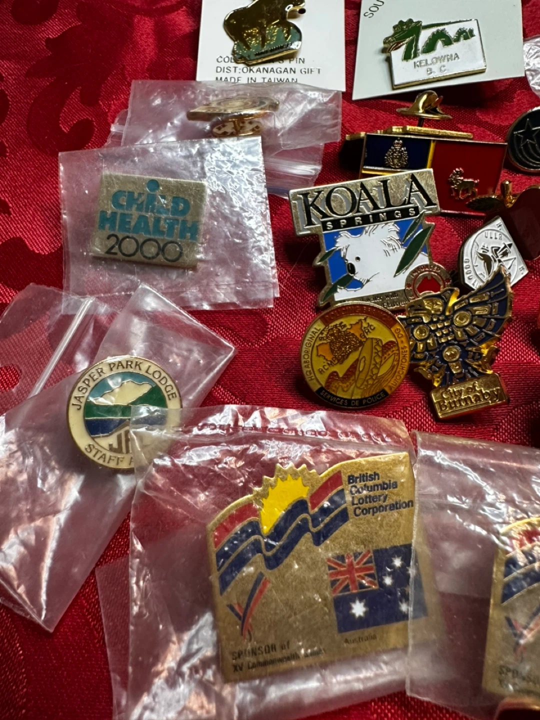 Assorted souvenir pins from various Canadian locations and events. Includes pins for British Columbia Lottery Corporation and BC Games volunteer. These pins are great for collectors or to commemorate a trip! Some knew some not.
