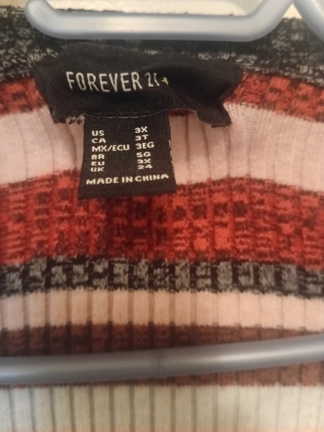 This is a Forever 21+ sweater dress with a v-neck and button details. It features a ribbed knit material in a multicoloured stripe pattern. The size is 3X.