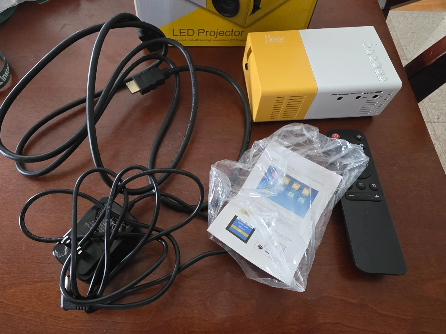 This Neer LED projector comes with a remote control, HDMI cable, and power adapter. It's a compact unit, perfect for presentations or movie nights! Includes instructions.