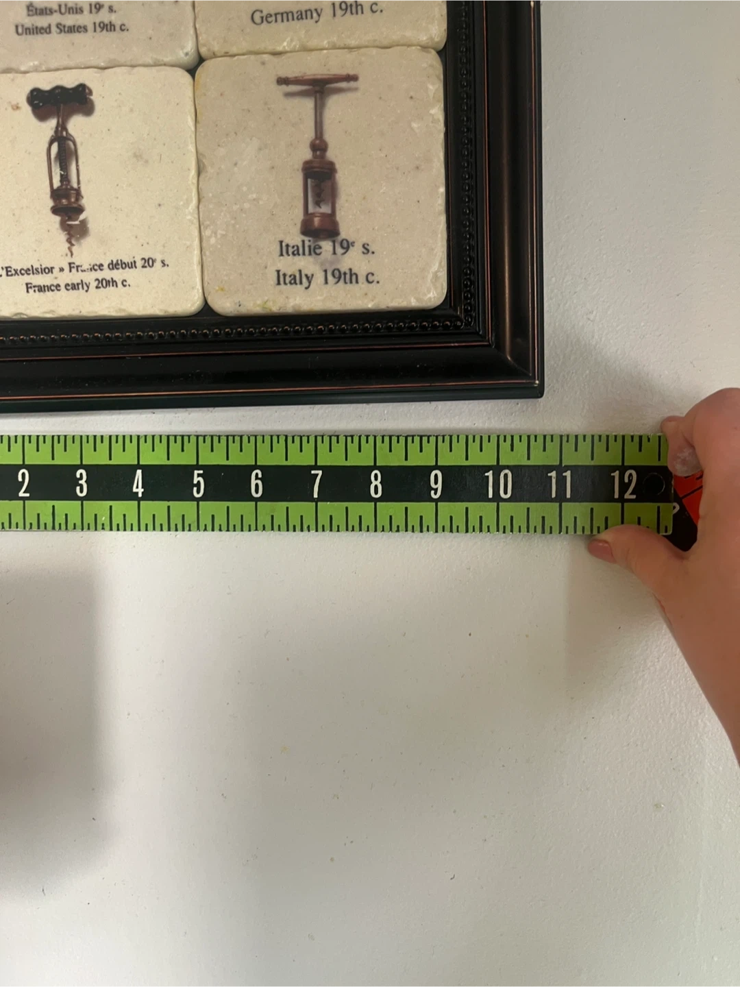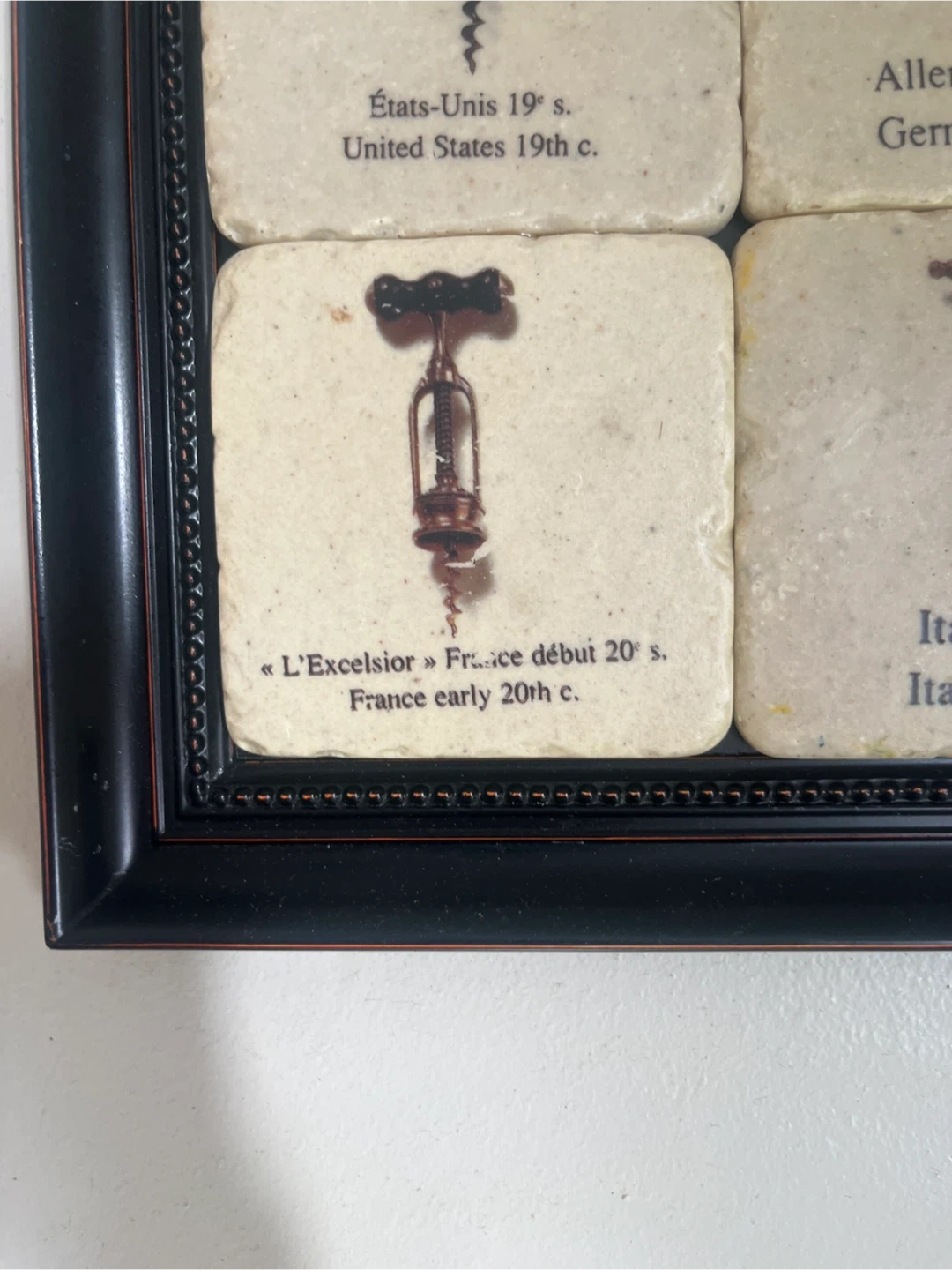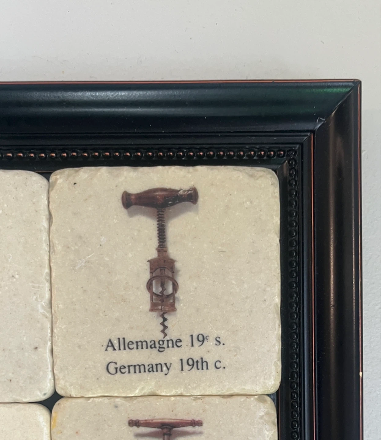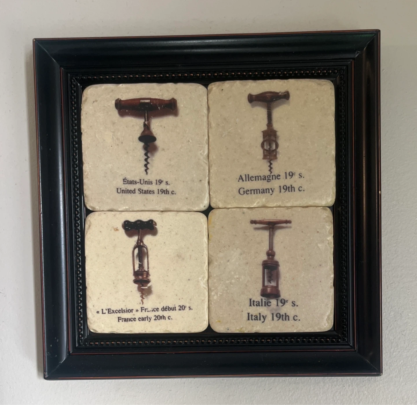 Four framed tile prints showcase historical corkscrew designs from the United States, Germany, France, and Italy. Each print details the origin and approximate time period of the corkscrew. Adds a touch of vintage charm to any kitchen or bar area!