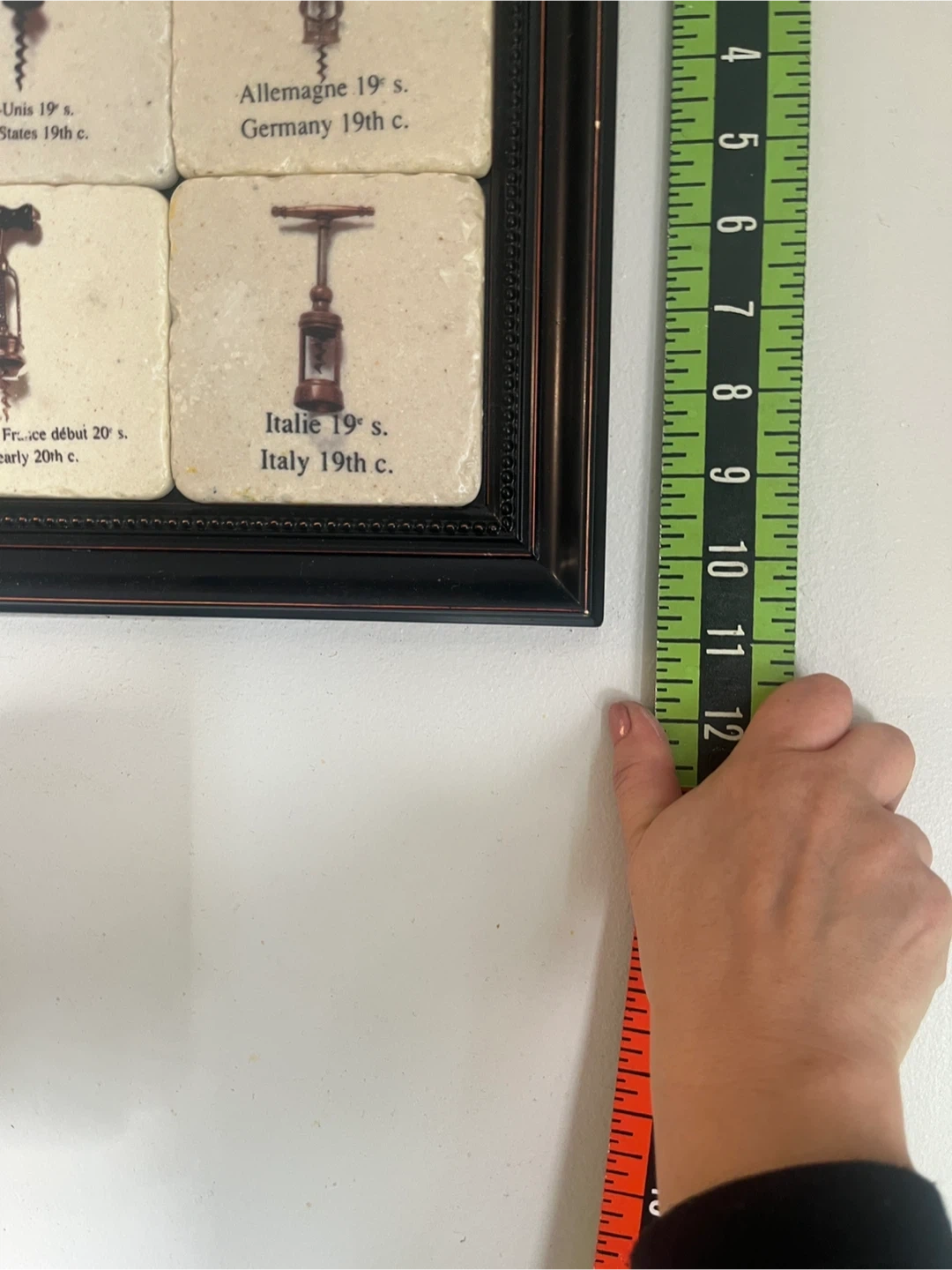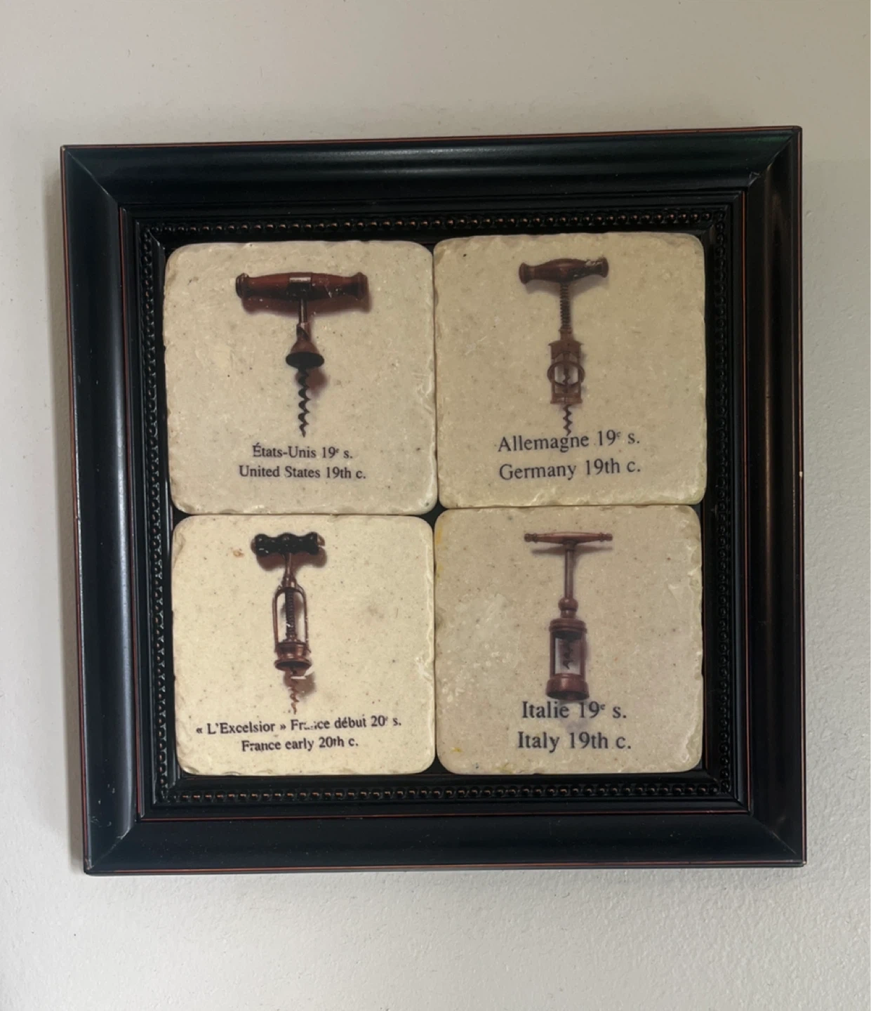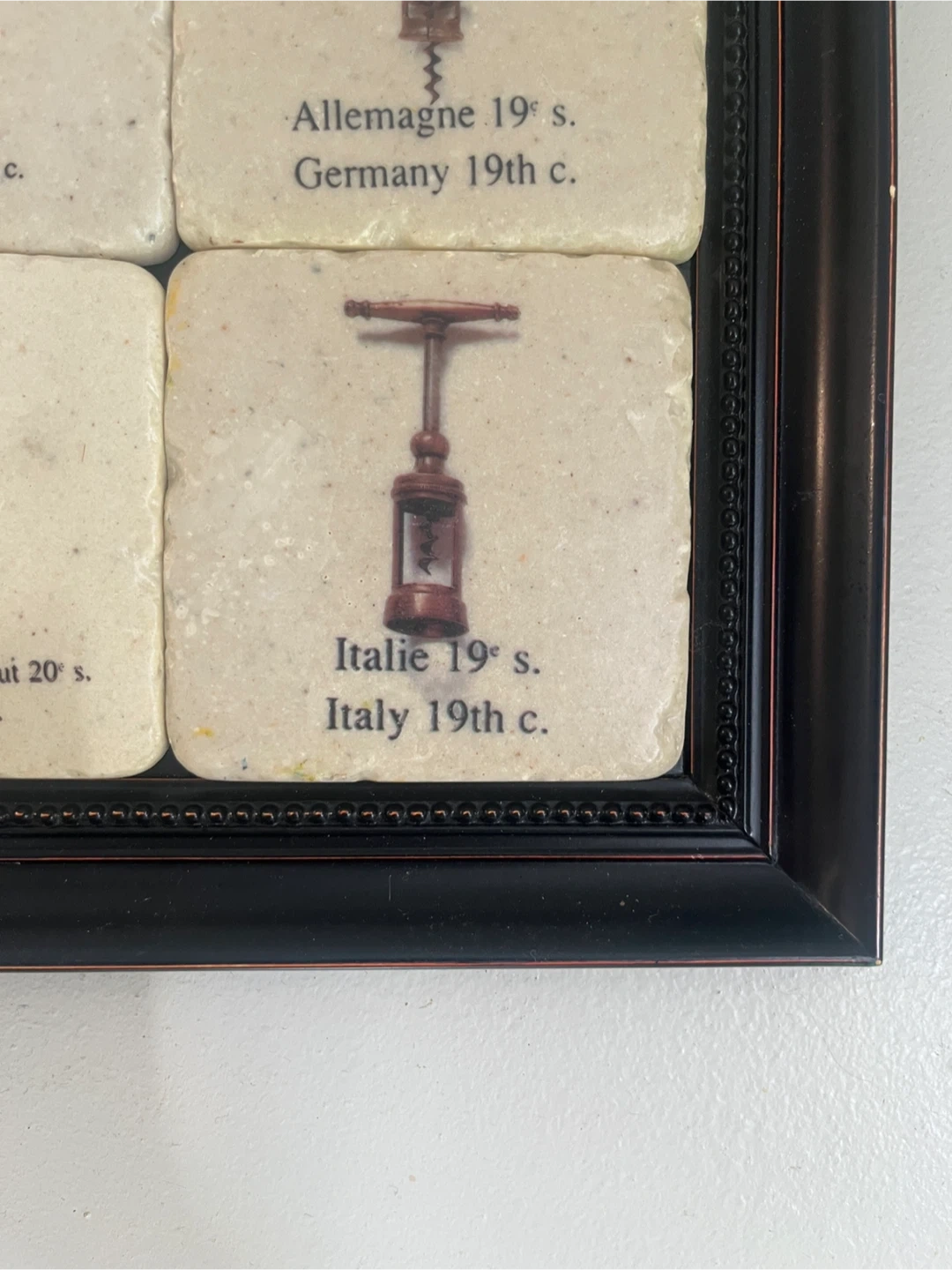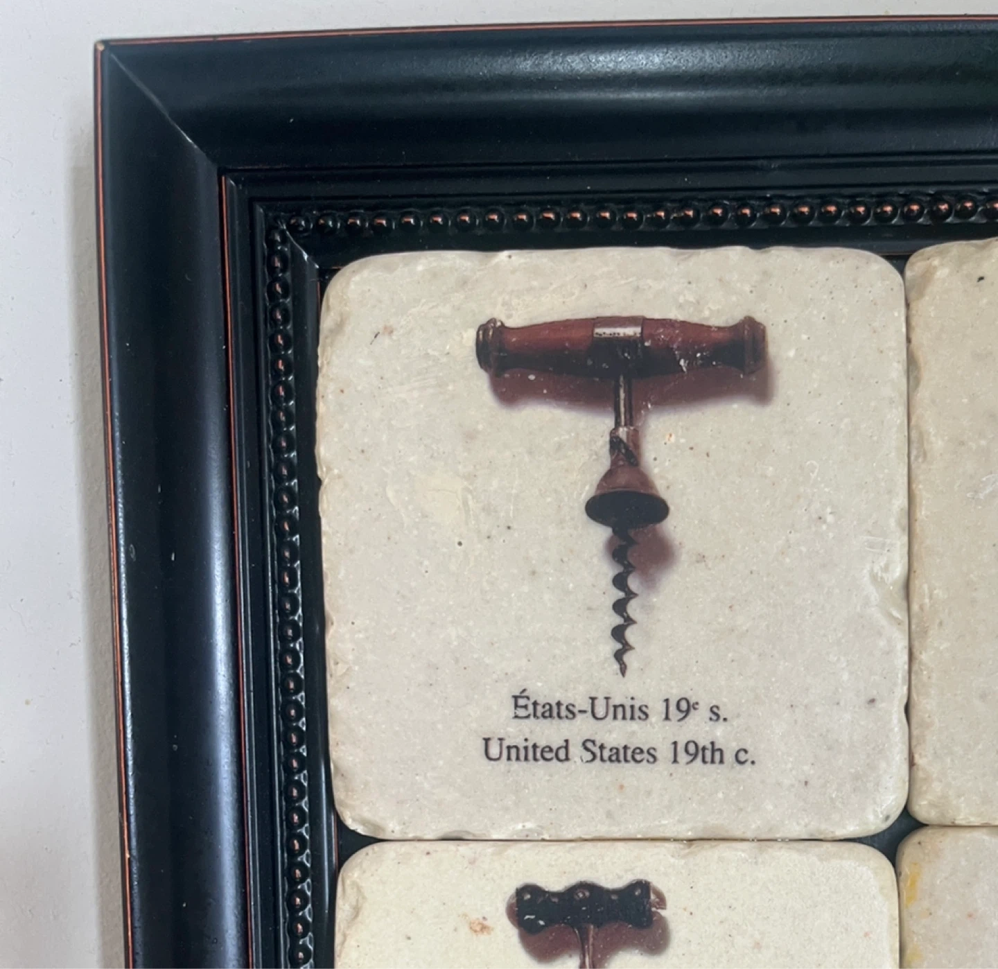 Four framed tile prints showcase historical corkscrew designs from the United States, Germany, France, and Italy. Each print details the origin and approximate time period of the corkscrew. Adds a touch of vintage charm to any kitchen or bar area!