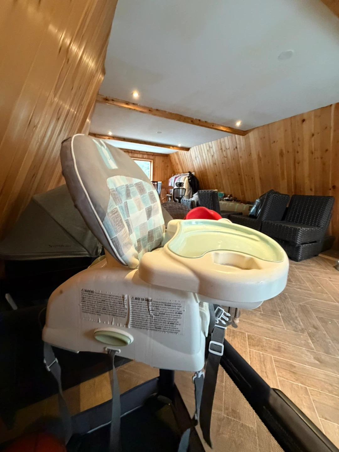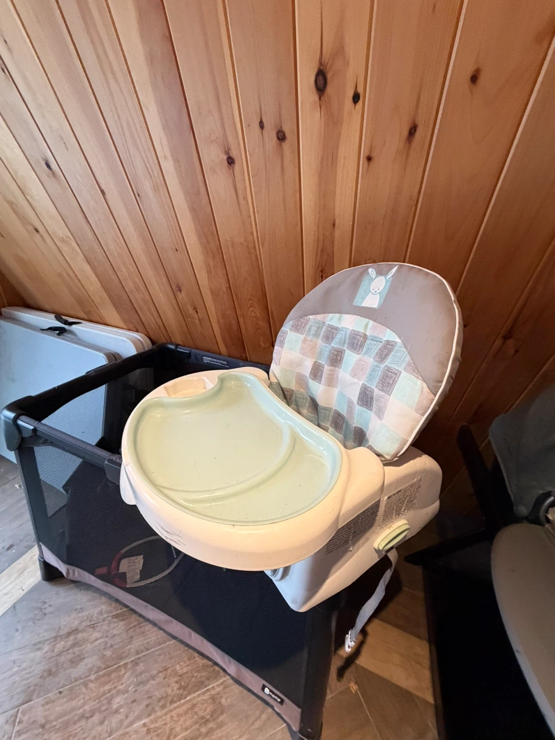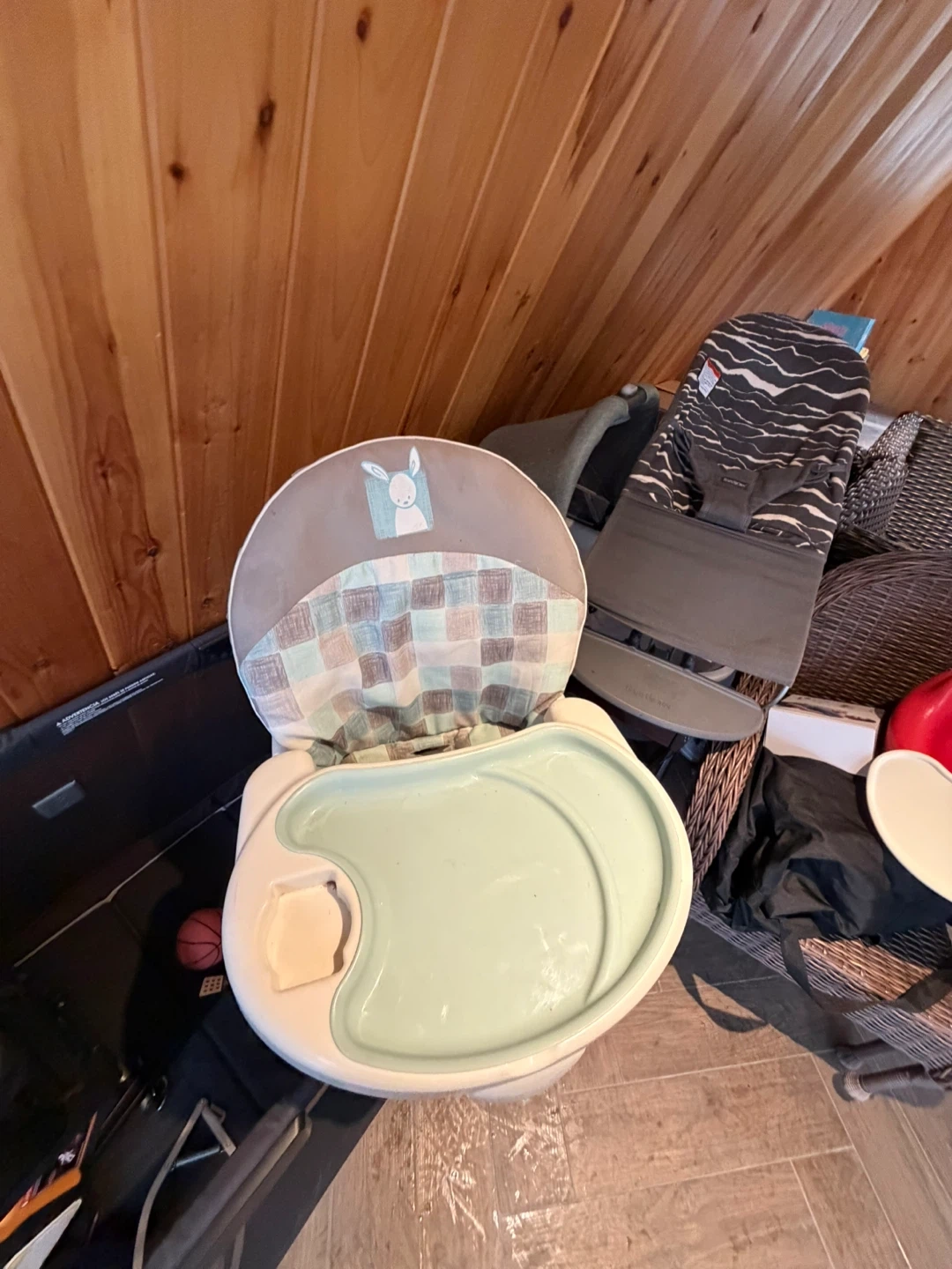 This is a Safety 1st high chair booster seat. It has a removable tray and a 3-point harness for safety. The seat pad is wipeable and features a cute bunny design. It's perfect for making meal times easier at home or on the go!