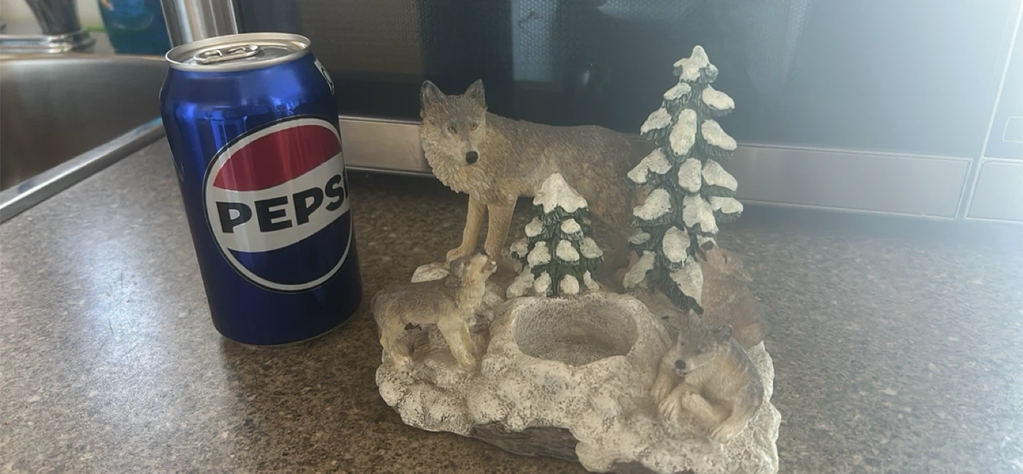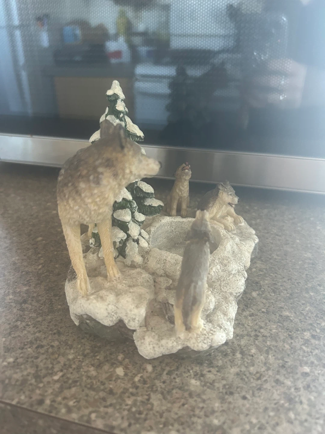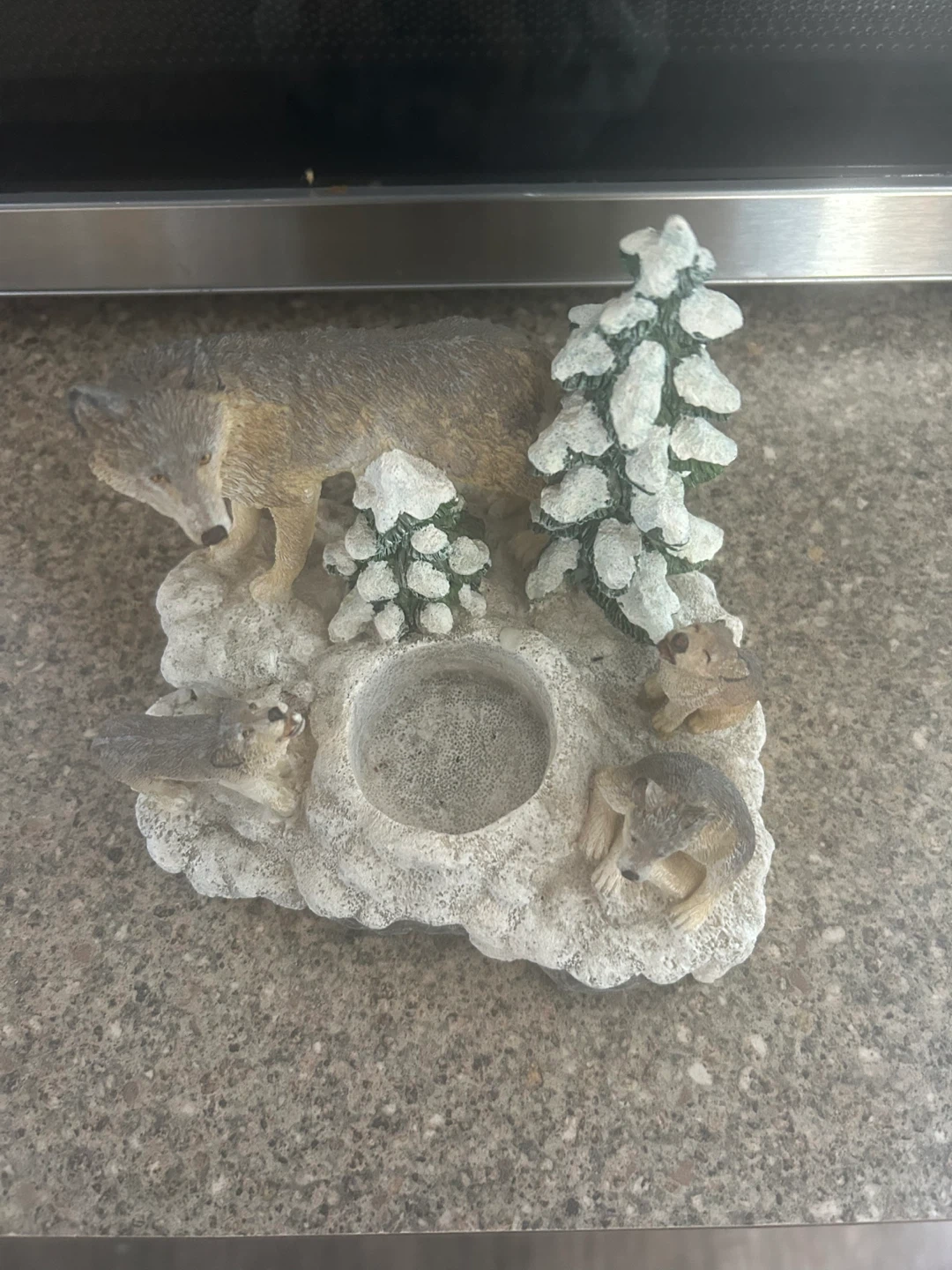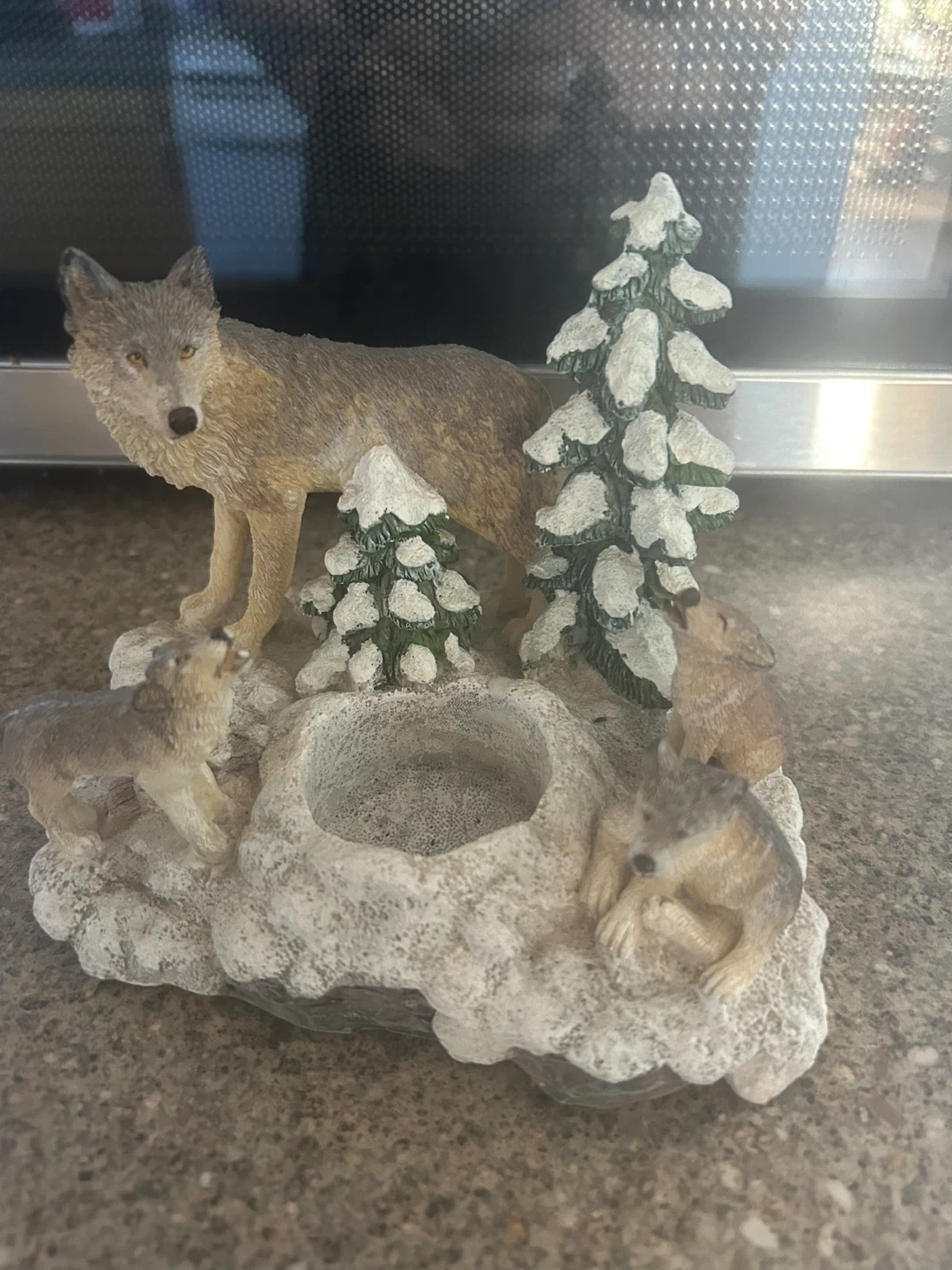 This decorative candle holder features a wolf family in a snowy forest setting. It's designed to hold a single pillar candle. A unique piece for your home decor!