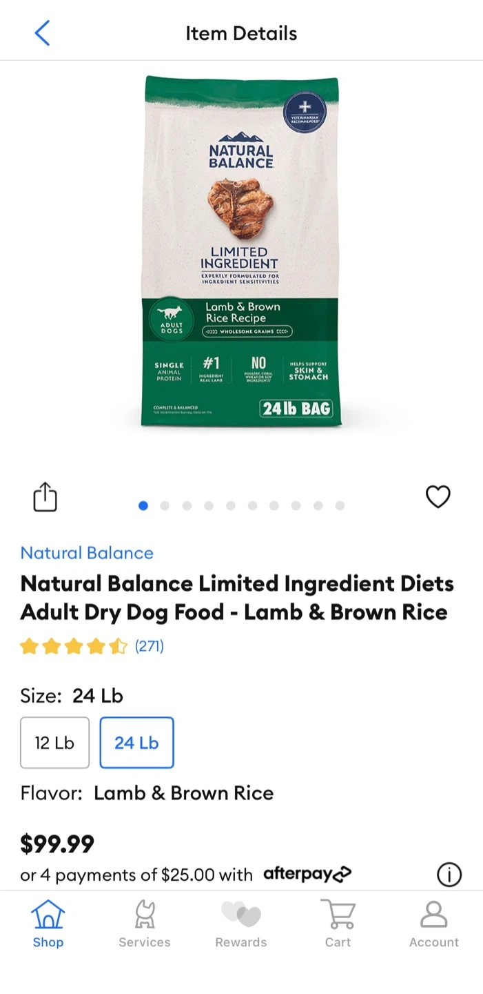 Unopened. This is a 24 Lb bag of Natural Balance Limited Ingredient Diets Adult Dry Dog Food. It's the Lamb & Brown Rice recipe. Veterinarian recommended, it features single animal protein and helps support skin and stomach health.