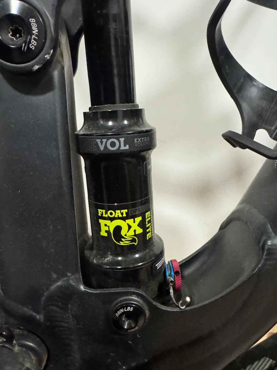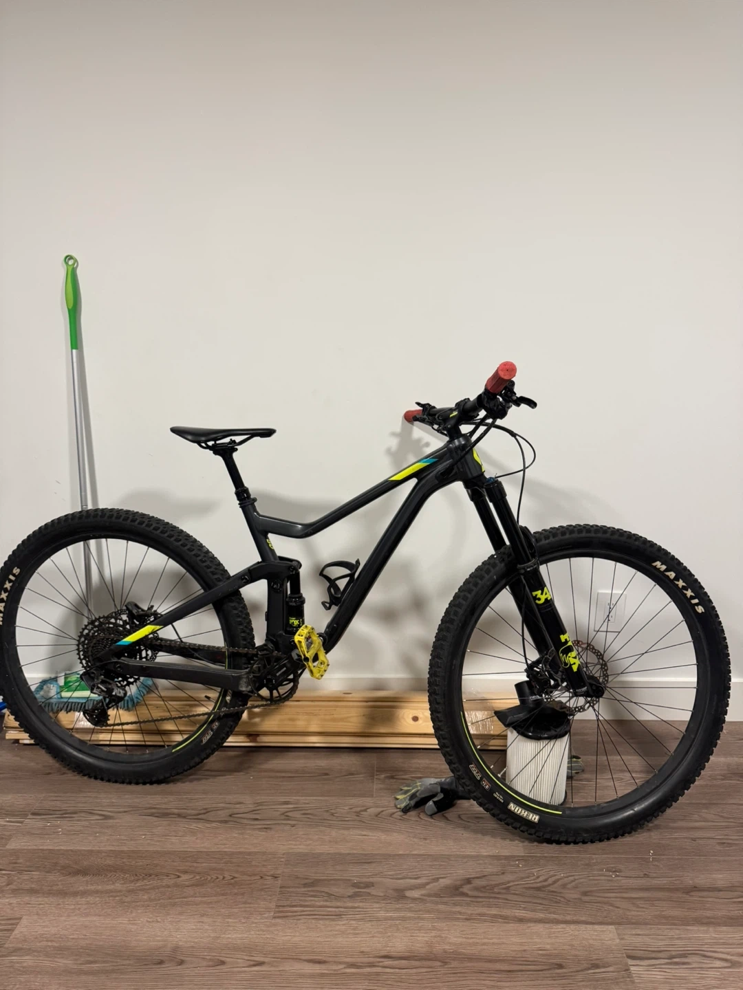 Full suspension mountain bike with a Fox Float DPS Elite rear shock. It has Maxxis tires and bright yellow pedal accents. This bike is ready for trails!