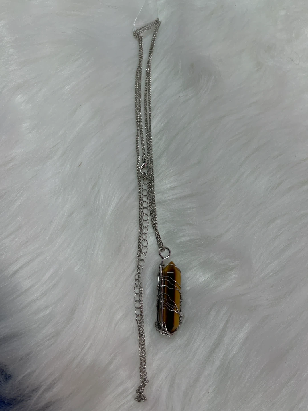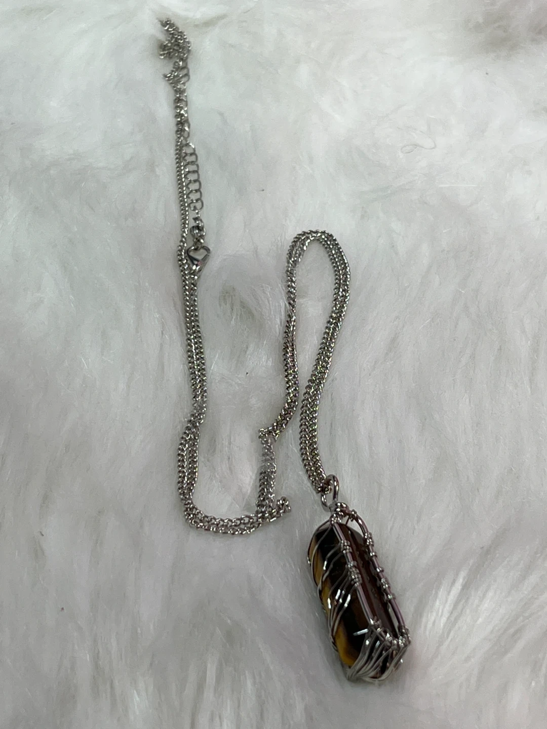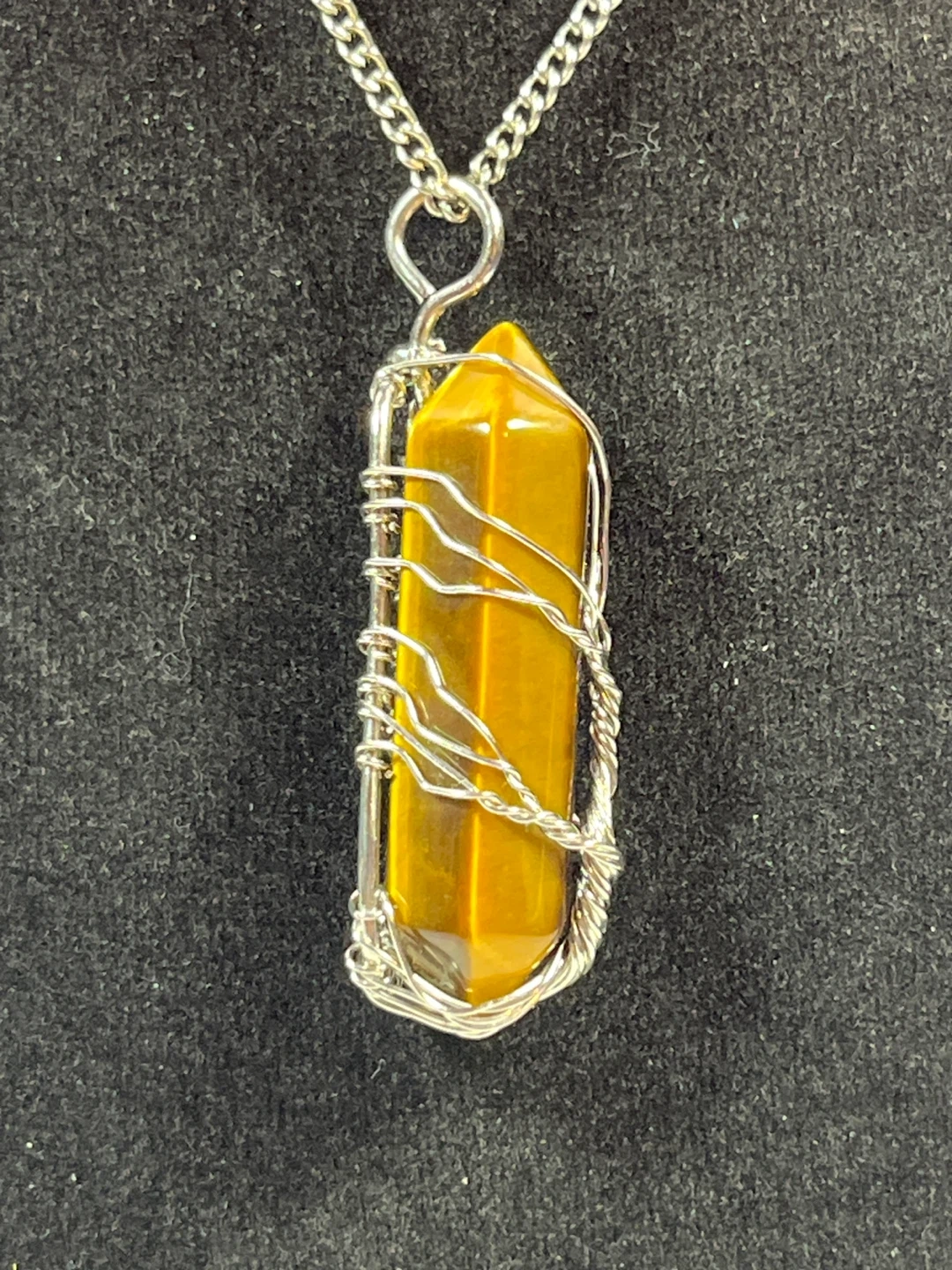 Material: The pendant features a natural tiger's eye crystal with golden-brown hues and a silky luster. The wire and chain is silver-toned.
