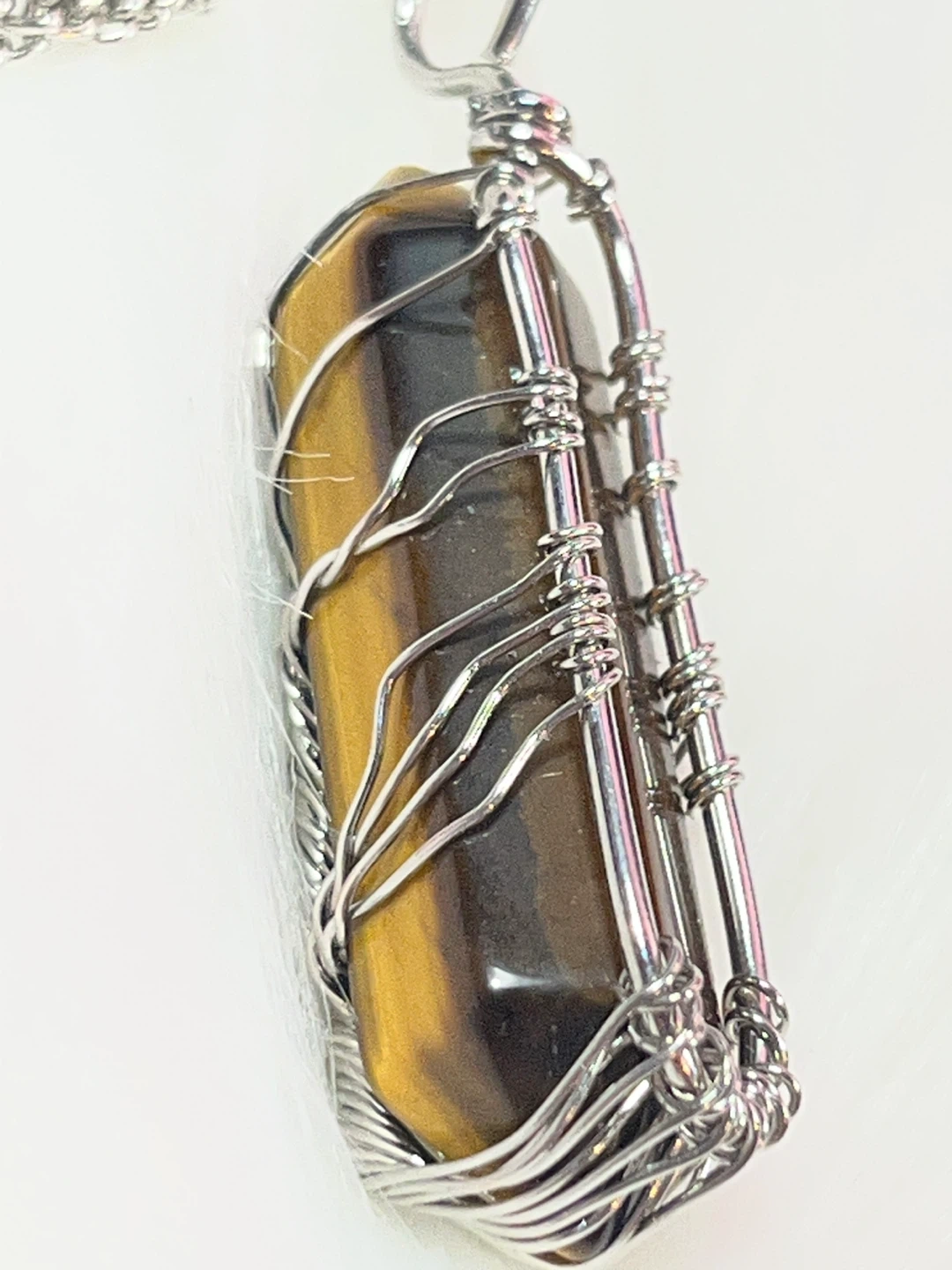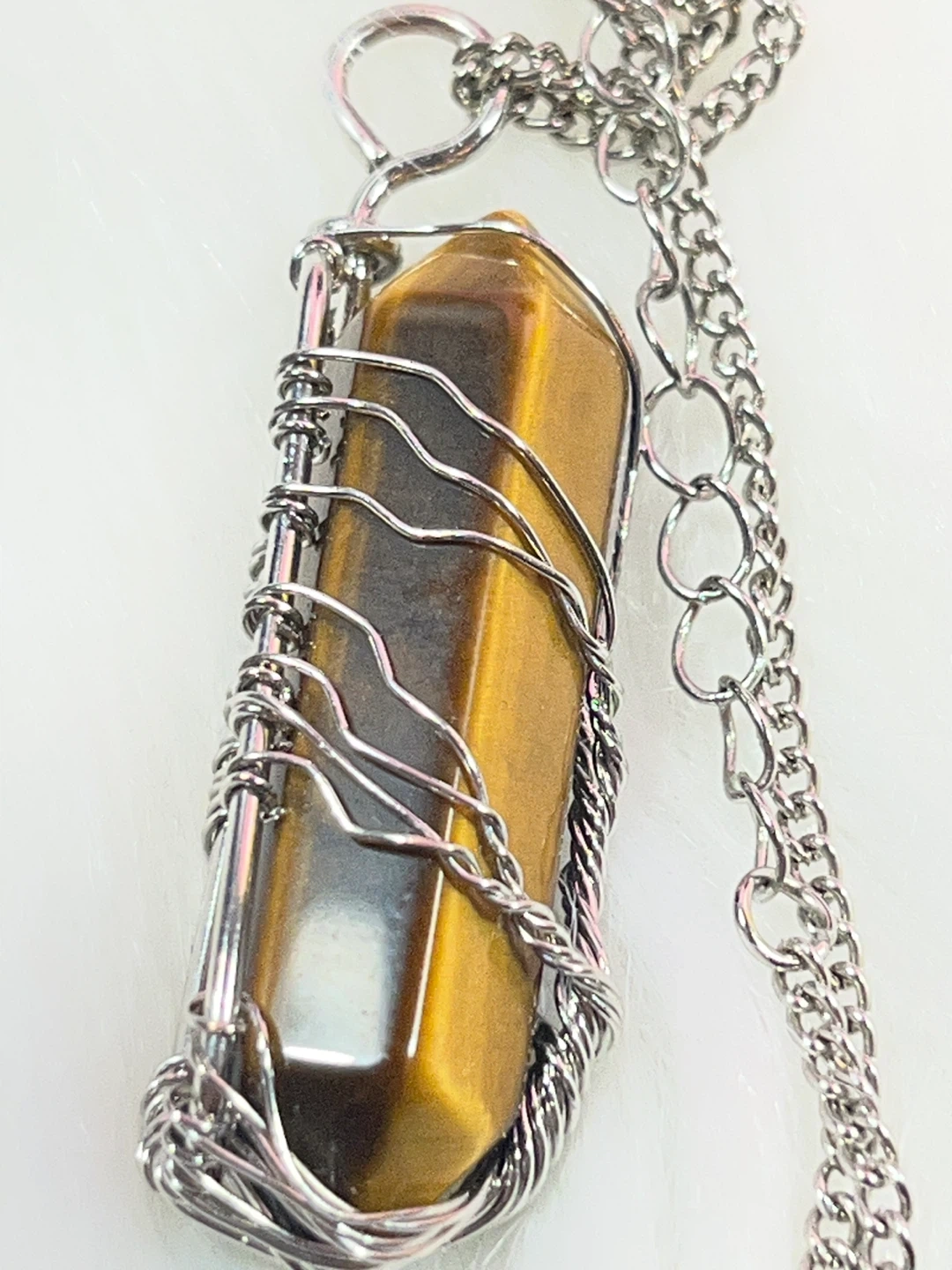 The item in the image is a wire-wrapped tiger's eye crystal pendant necklace. It features a polished, rectangular tiger's eye gemstone wrapped in intricate, silver-toned wire, suspended from a matching chain.