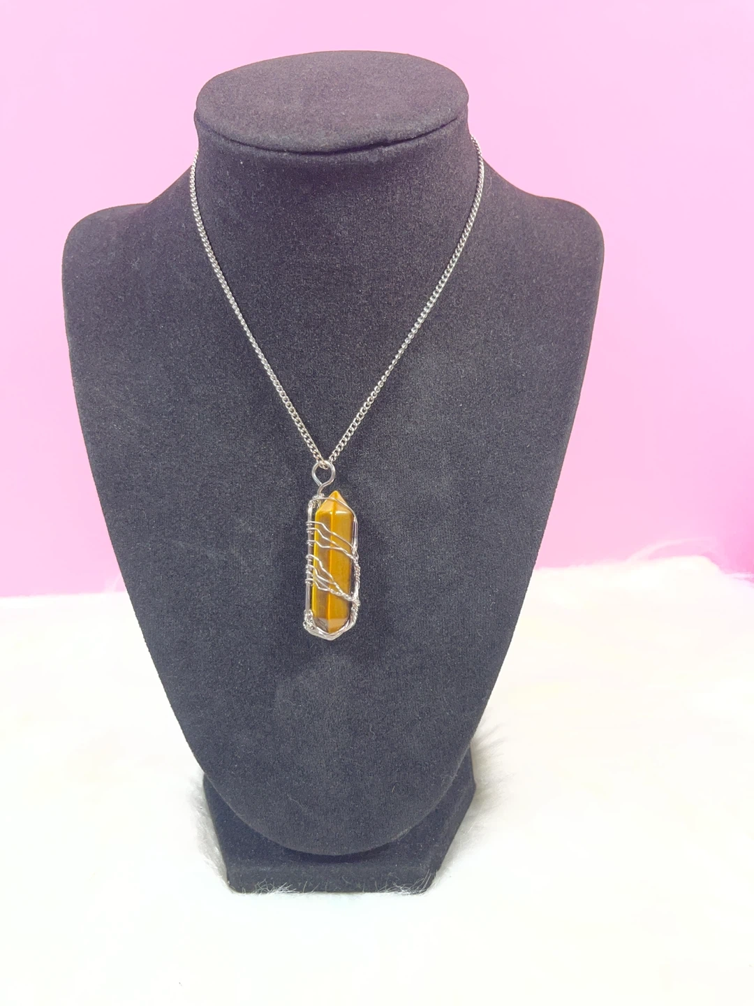 Material: The pendant features a natural tiger's eye crystal with golden-brown hues and a silky luster. The wire and chain is silver-toned.