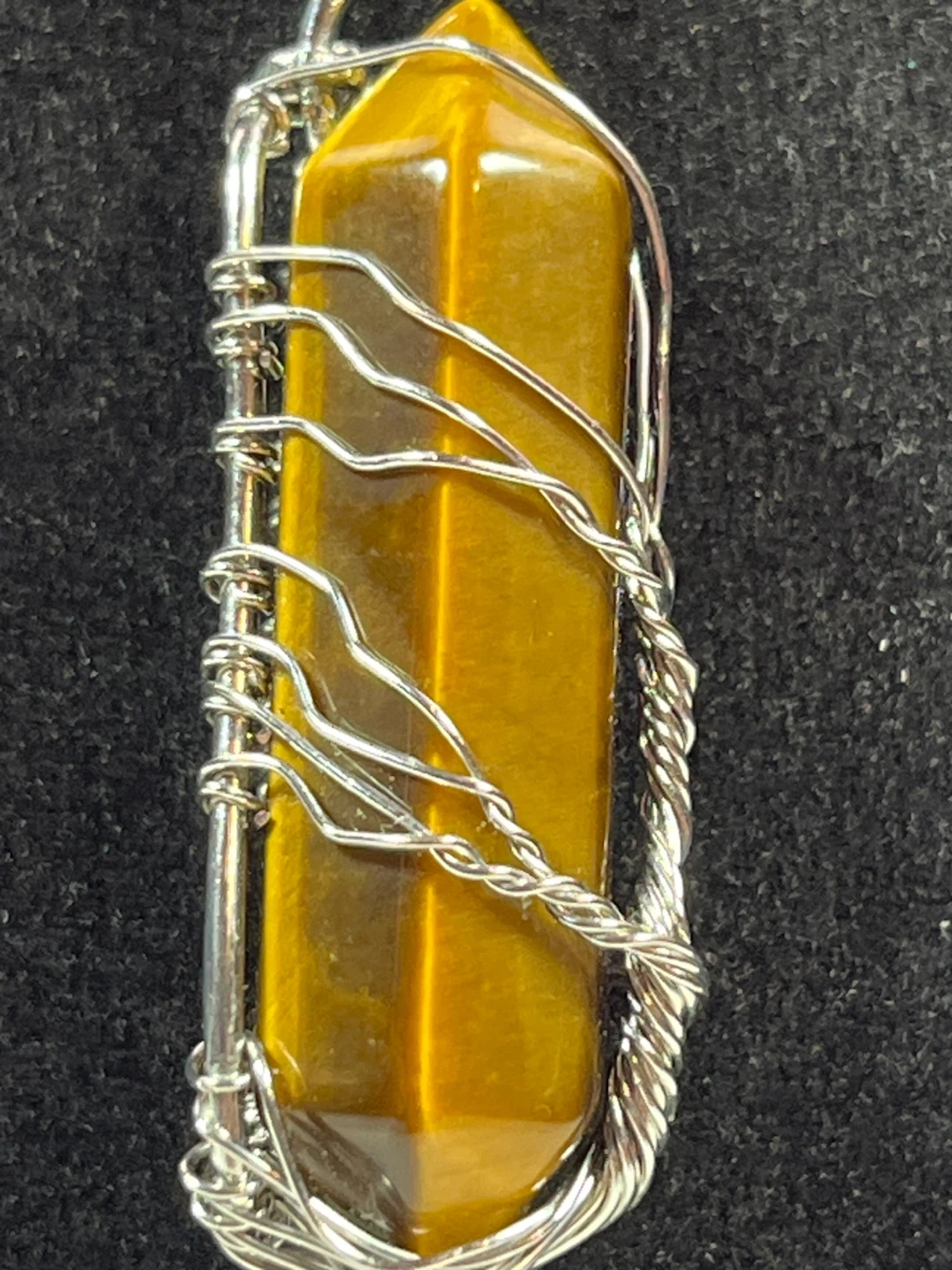 The item in the image is a wire-wrapped tiger's eye crystal pendant necklace. It features a polished, rectangular tiger's eye gemstone wrapped in intricate, silver-toned wire, suspended from a matching chain.