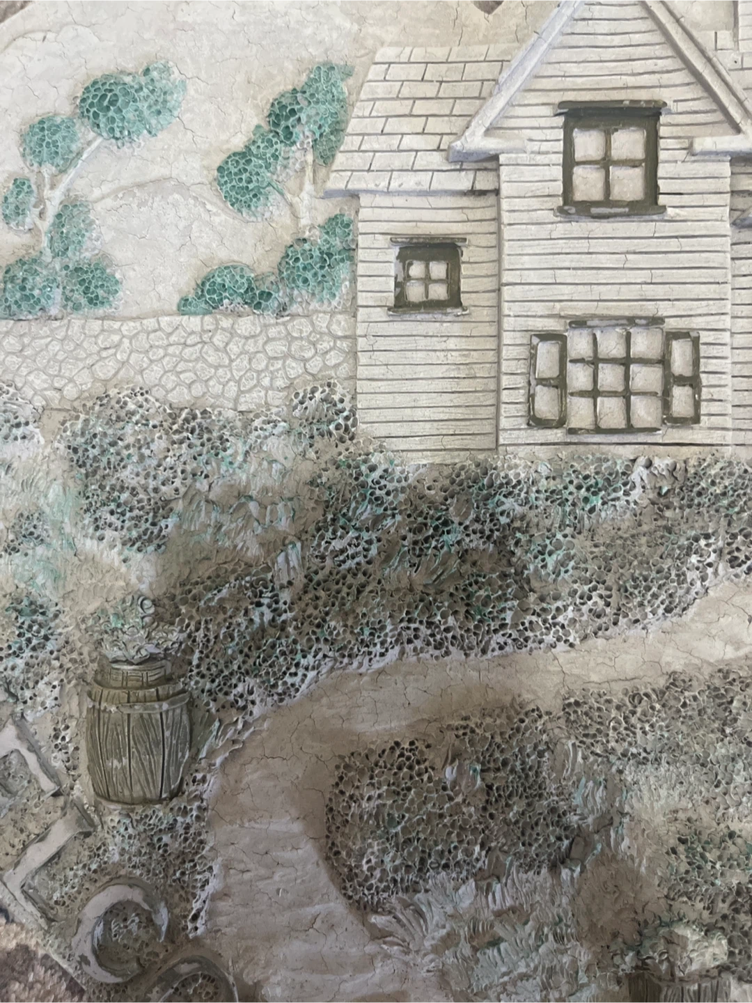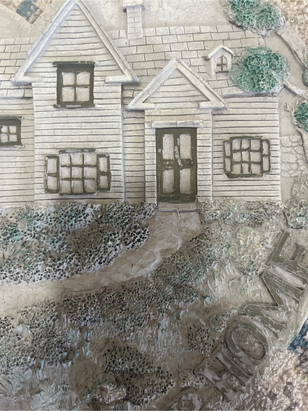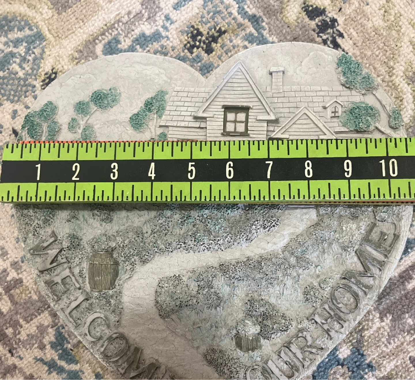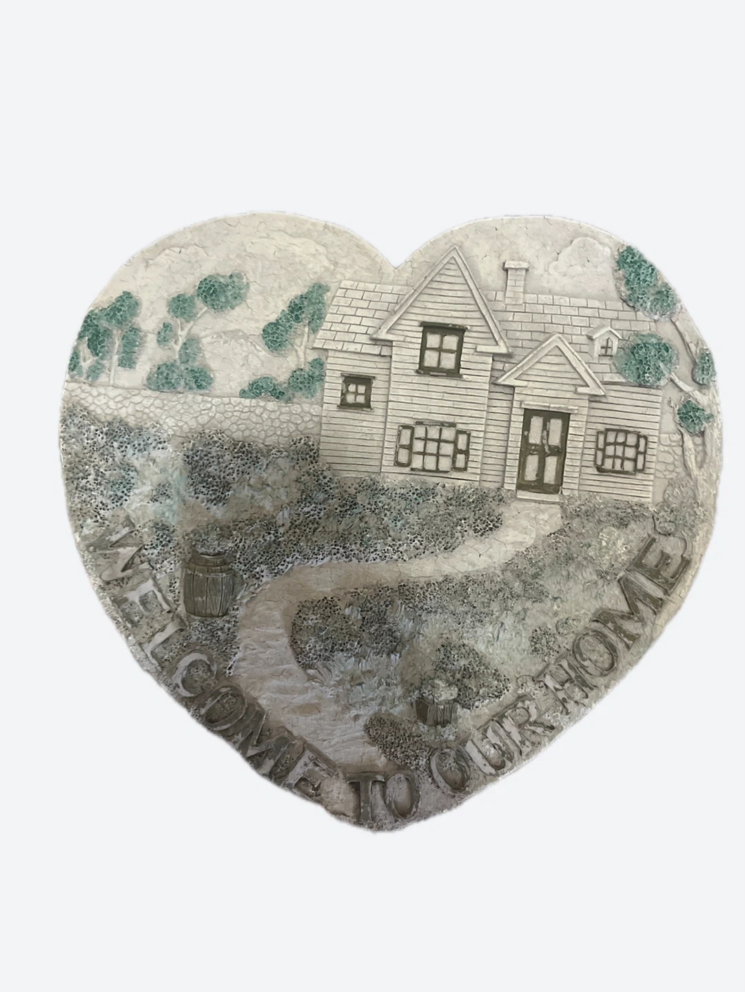 This heart-shaped garden plaque features a raised relief of a house with a winding path and trees. The words 'WELCOME TO OUR HOME' are embossed around the bottom edge. It's a lovely decorative piece for any garden or entryway. Made of durable material.