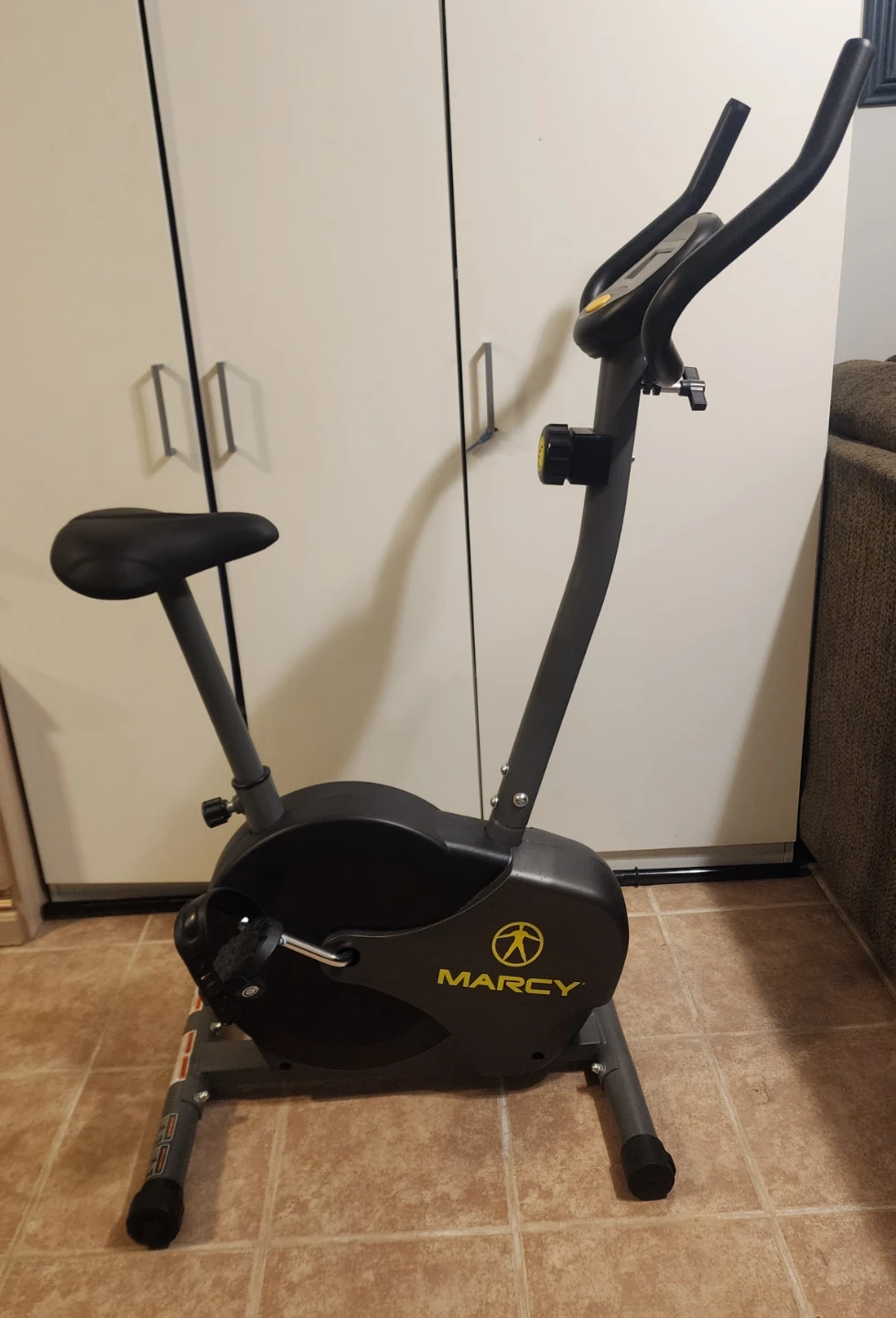 A Marcy upright exercise bike. It features adjustable resistance. Seat height is also adjustable. Great for home cardio workouts!
