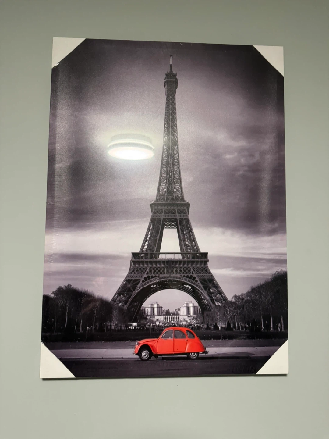 This canvas print features a black and white image of the Eiffel Tower with a bright red car in the foreground. It's a stylish piece of wall art for any room. Printed on canvas.