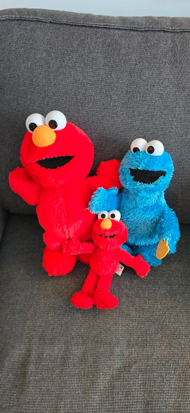 This set includes three Sesame Street plush toys: Tickle Me Elmo Feed Me a cookie Monster both in working condition. They're made from soft, fuzzy material, perfect for cuddling. These iconic characters are a fun addition for any fan!