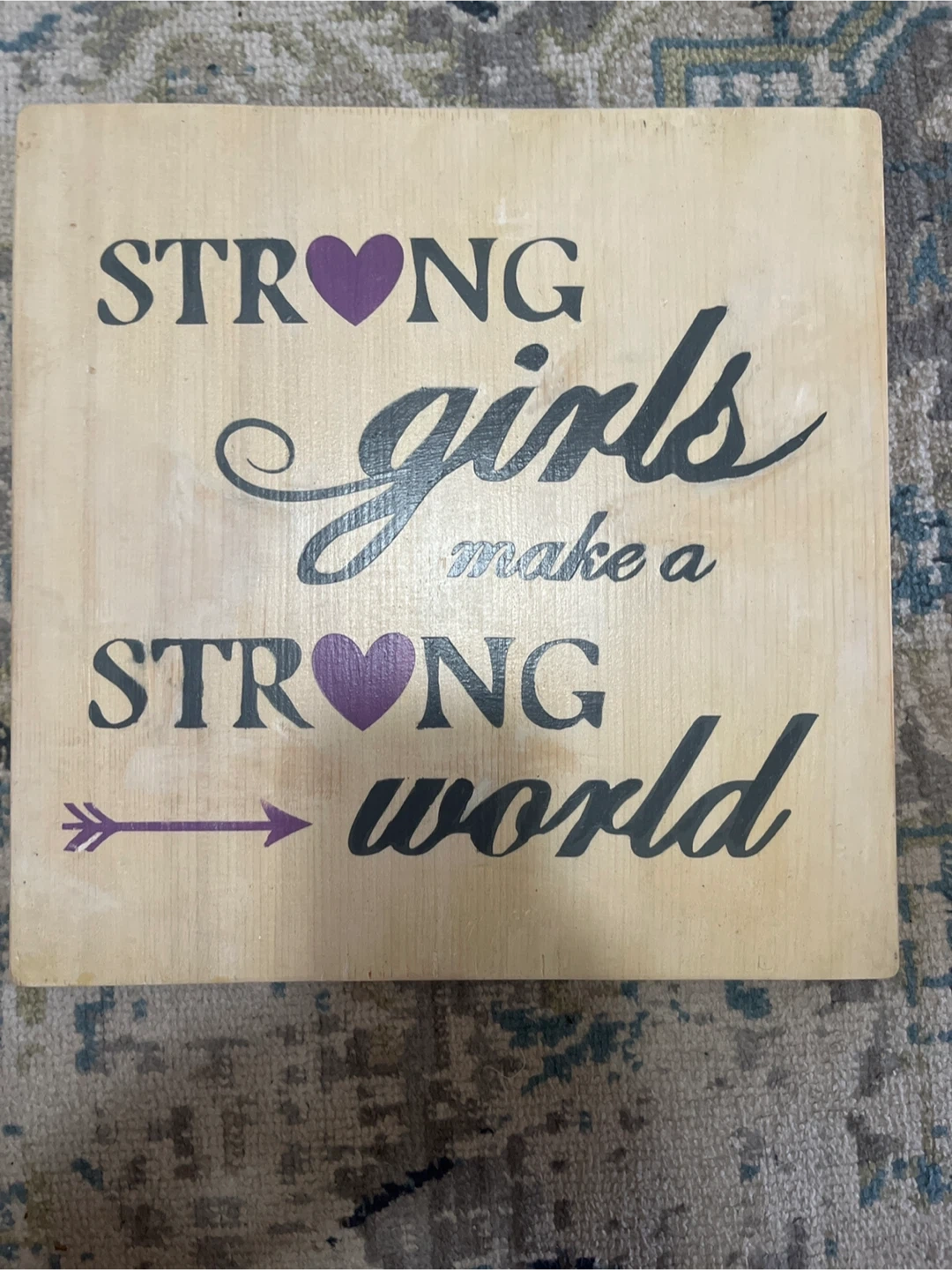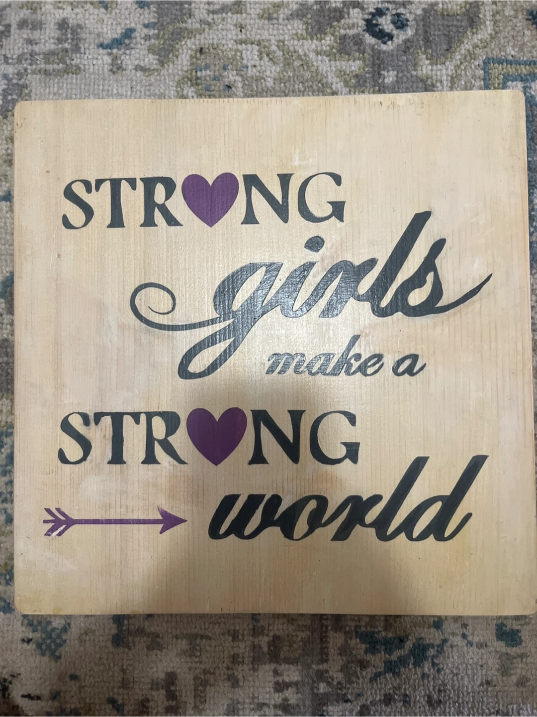 This is a wooden plaque with the inspirational quote "Strong girls make a strong world" printed on it. It features purple hearts and an arrow design. The sign is ready to hang with a string attached to the back.