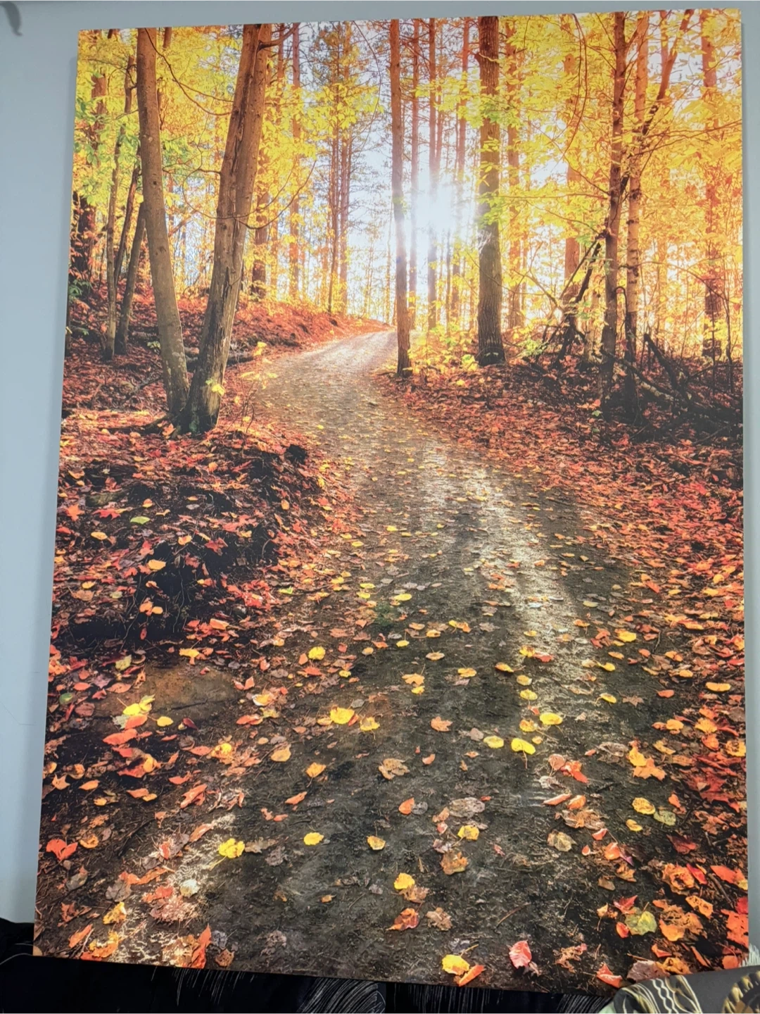 This wall art depicts a beautiful pathway through a forest in the fall. Sunbeams shine through the trees, illuminating the colourful fallen leaves on the ground. It's a lovely piece to bring a touch of nature indoors.