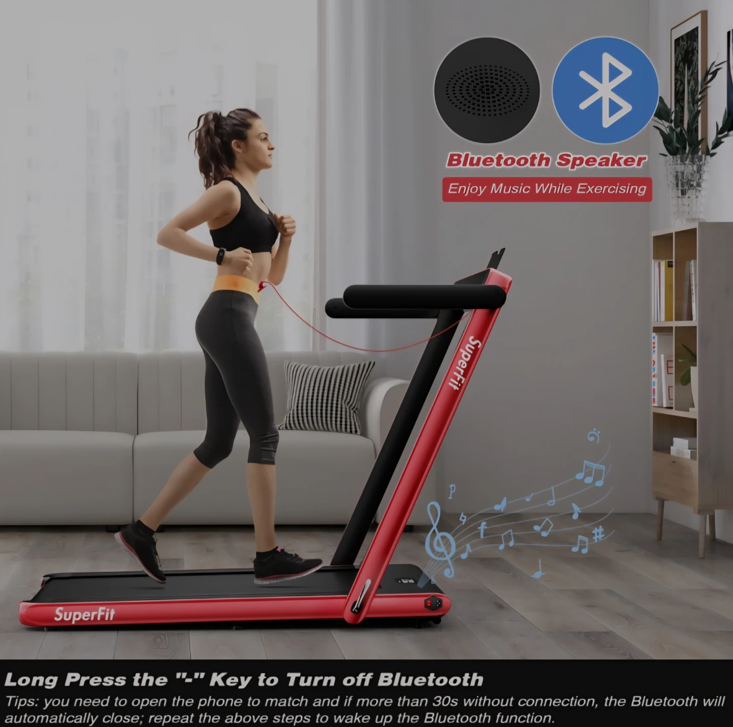 This quiet treadmill offers walking and running modes with speeds from 0.6-7.5MPH. It can be easily folded up and rolled under furniture when not in use to save space. The LED display shows time, speed, distance, and calories, and can be controlled via the control panel or remote control. It also has a Bluetooth speaker for music while exercising.