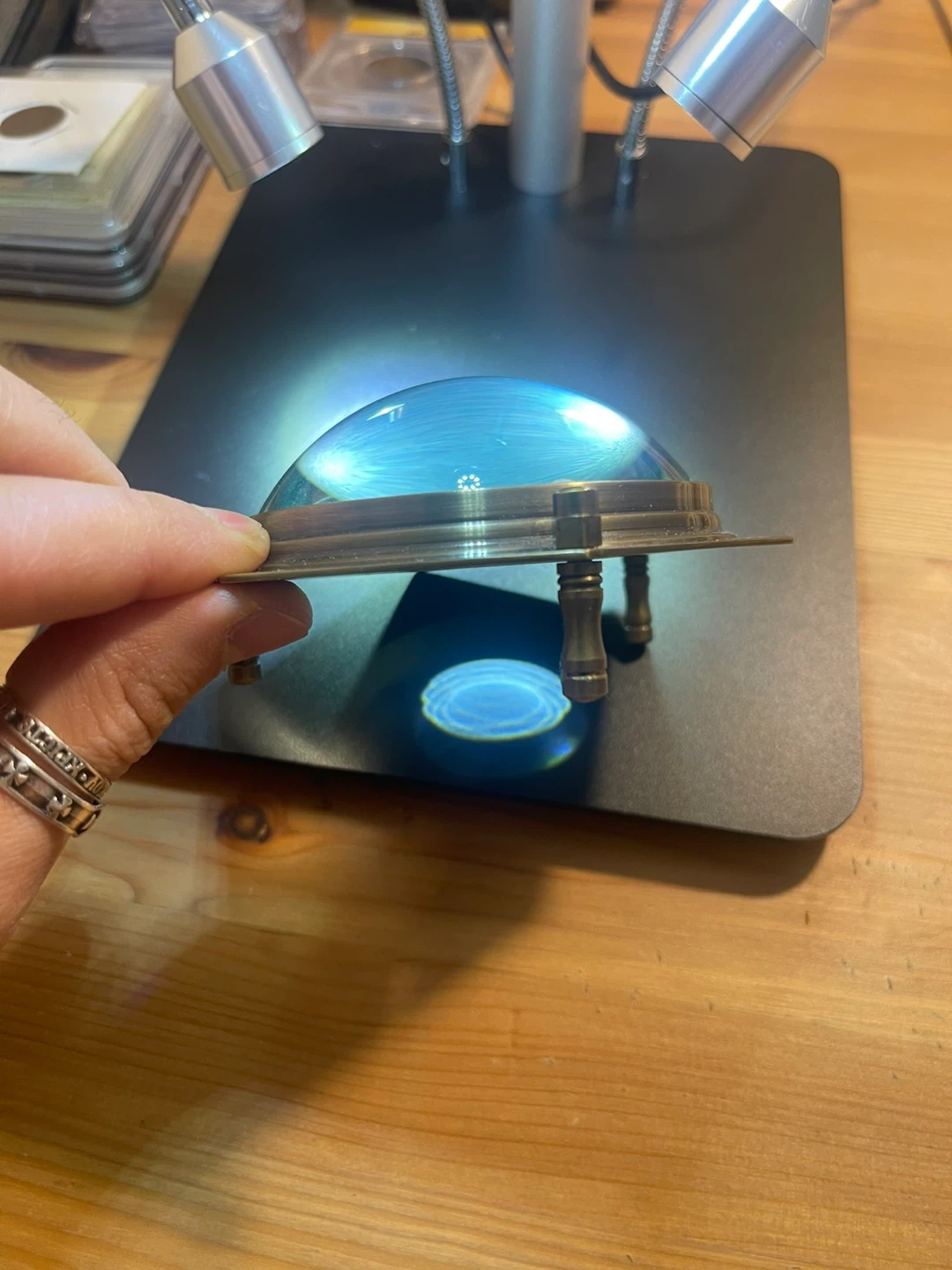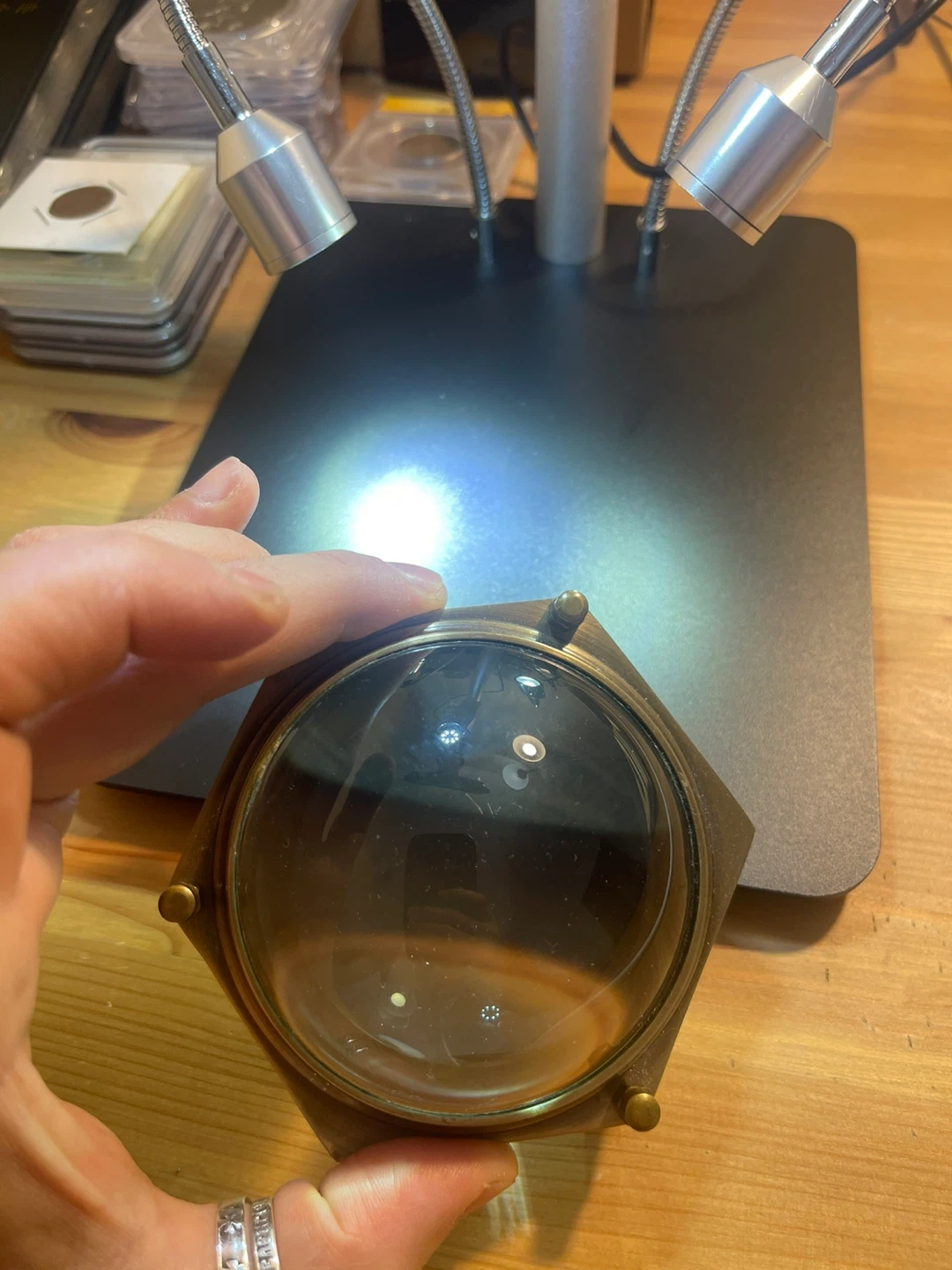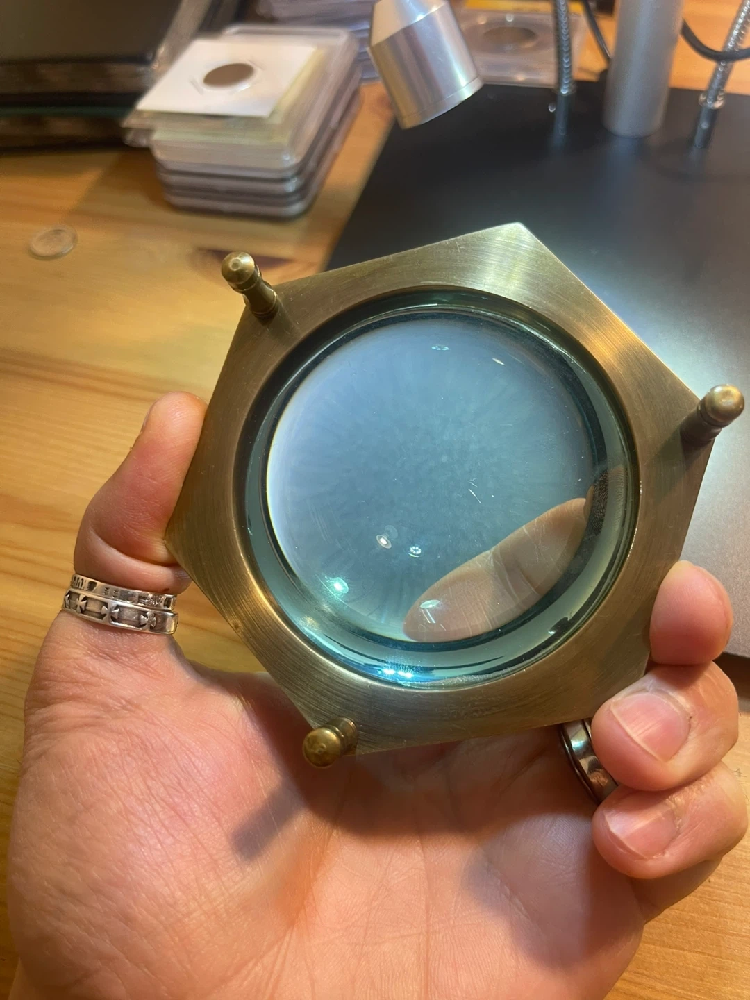 A unique magnifying glass featuring a hexagonal brass frame and a clear glass lens. It's designed with four small feet for standing. This magnifier is perfect for close examination of details.