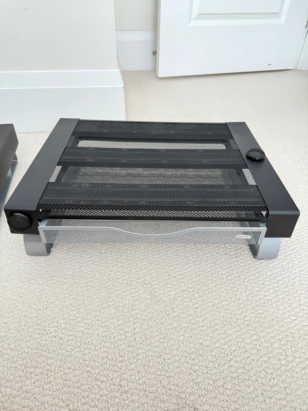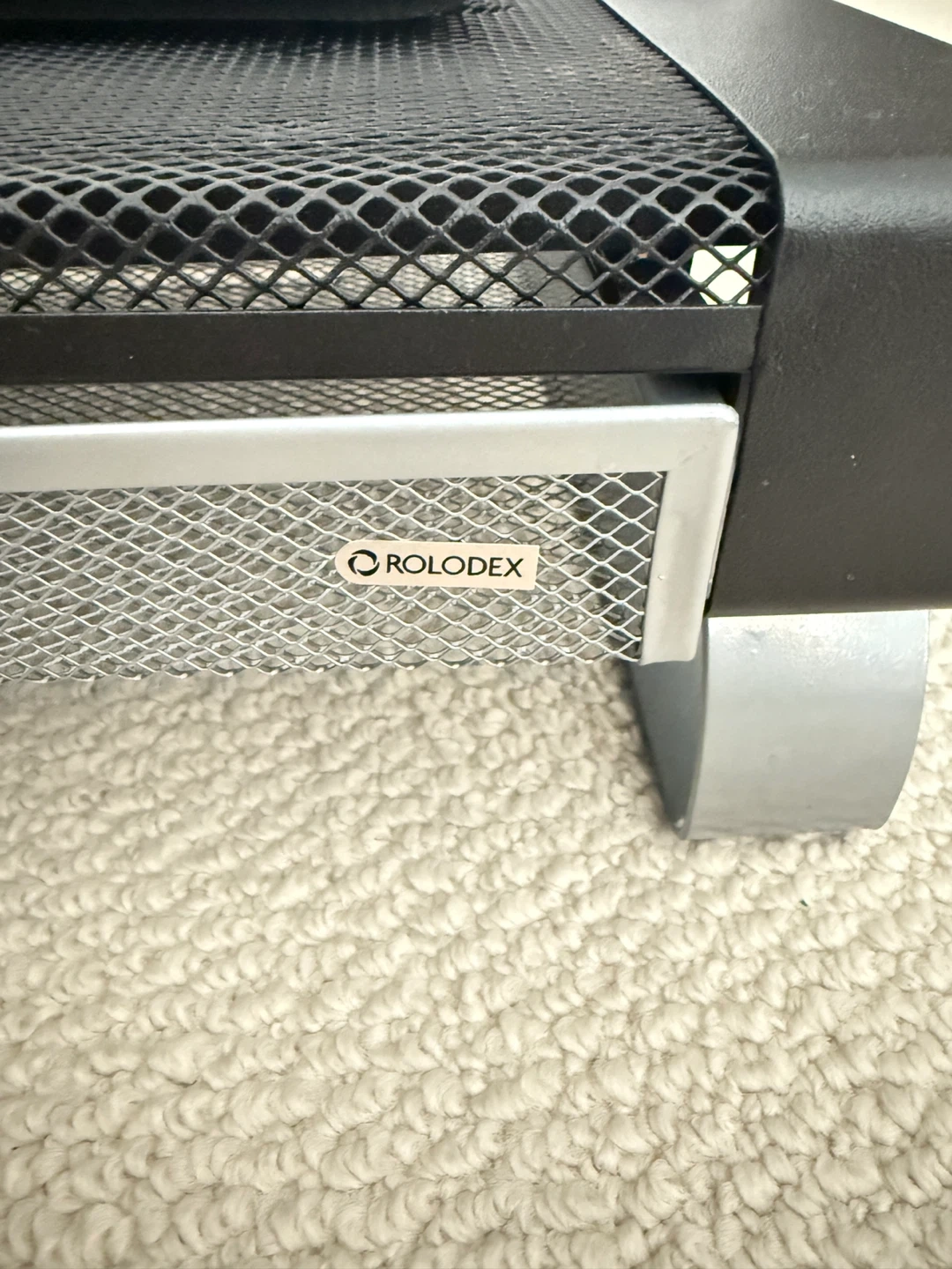 This Rolodex monitor riser stand is designed with a black mesh top and a sliding mesh drawer. It elevates your monitor or laptop for better ergonomics. The sturdy metal construction includes adjustable feet for stability. All for 40