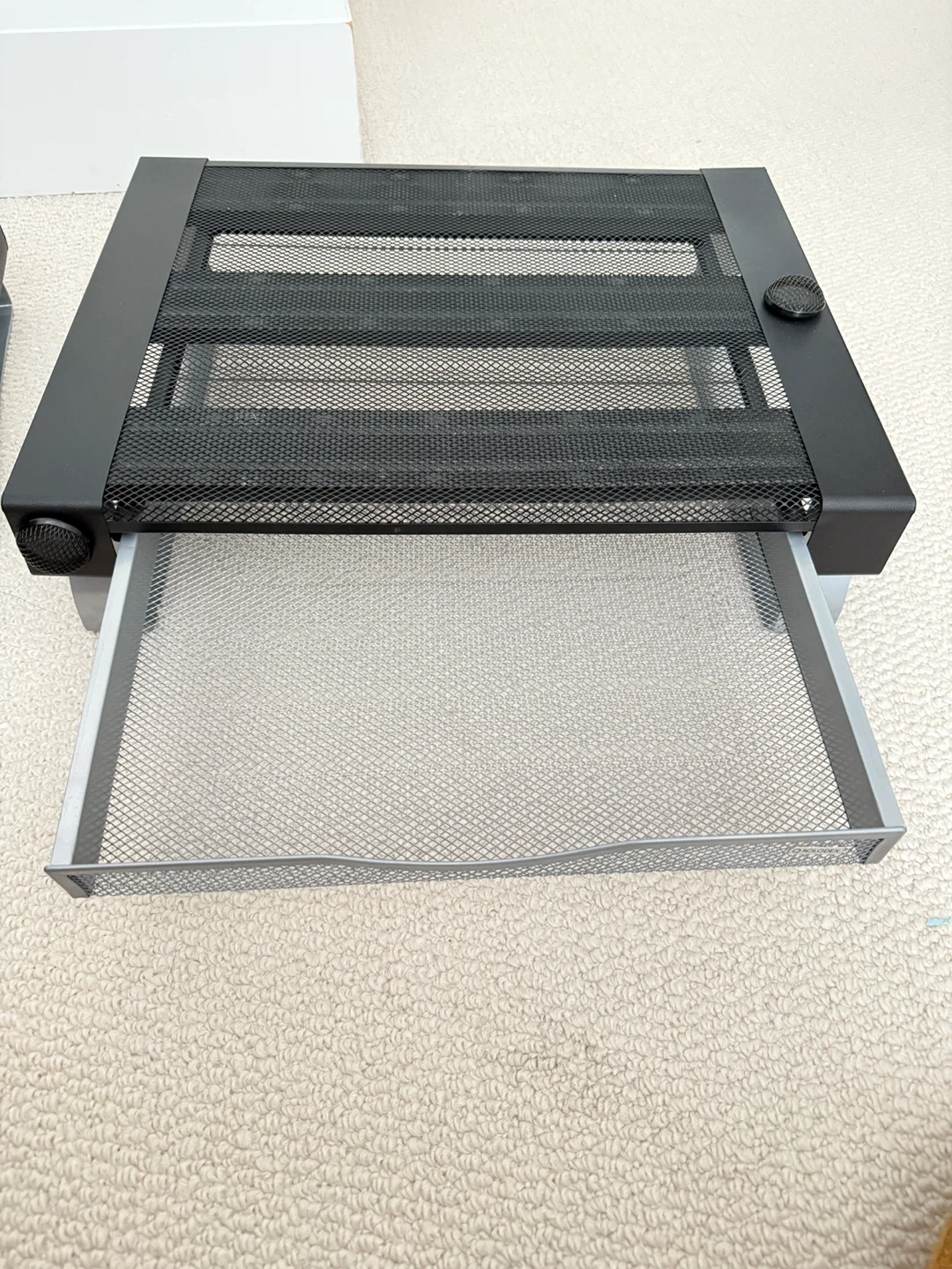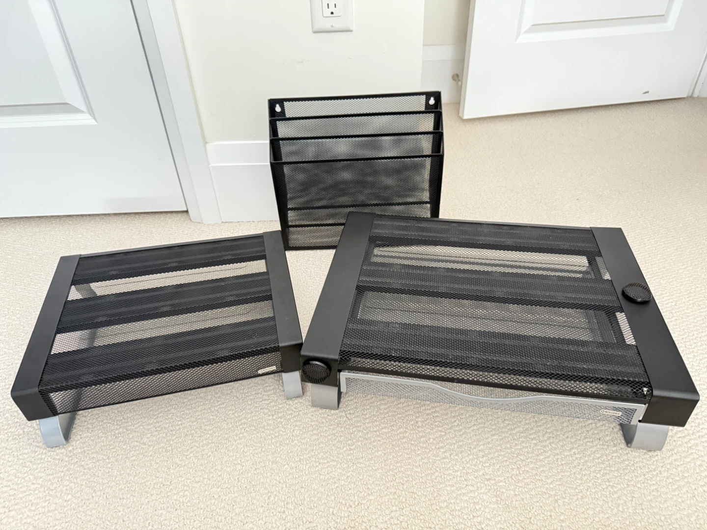This Rolodex monitor riser stand is designed with a black mesh top and a sliding mesh drawer. It elevates your monitor or laptop for better ergonomics. The sturdy metal construction includes adjustable feet for stability. All for 40