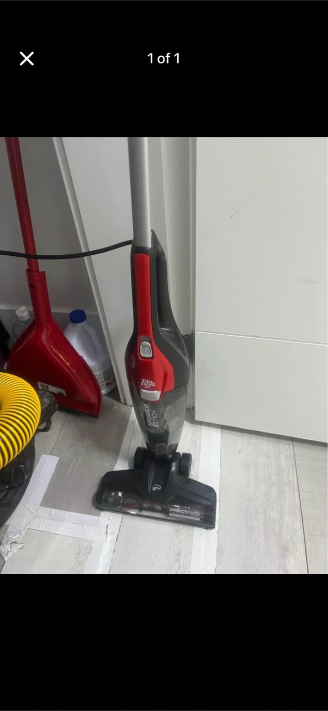 This is a red and black Dirt Devil Power Stick vacuum. It's a corded stick vacuum. It has a clear dustbin.